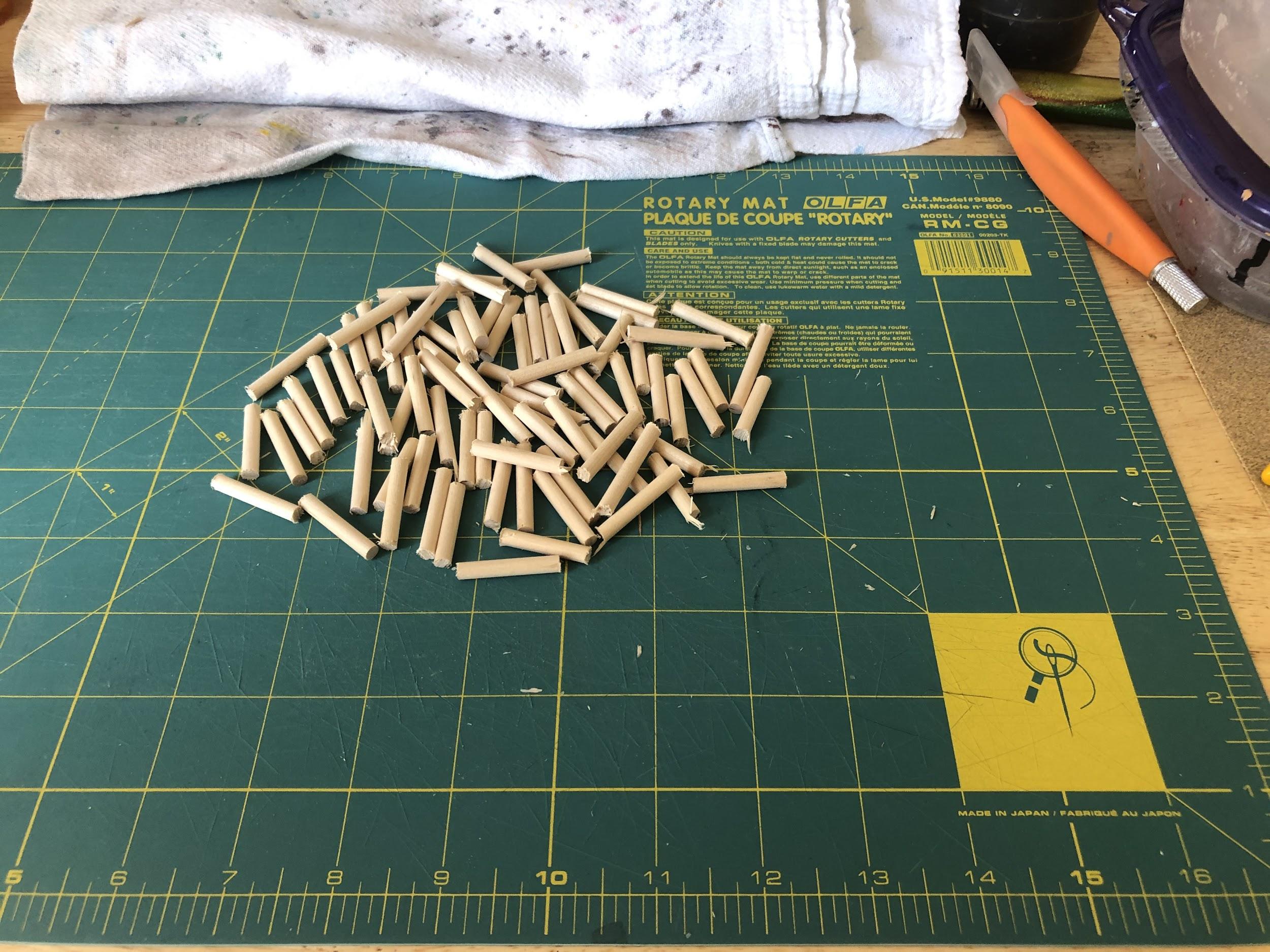 I made five piers at once this time. Each pier has 8 post holes. Each post hole will have two posts in it. I needed to make eighty 1” long dowel posts. You can make the dowels longer, like I did for my first few piers.