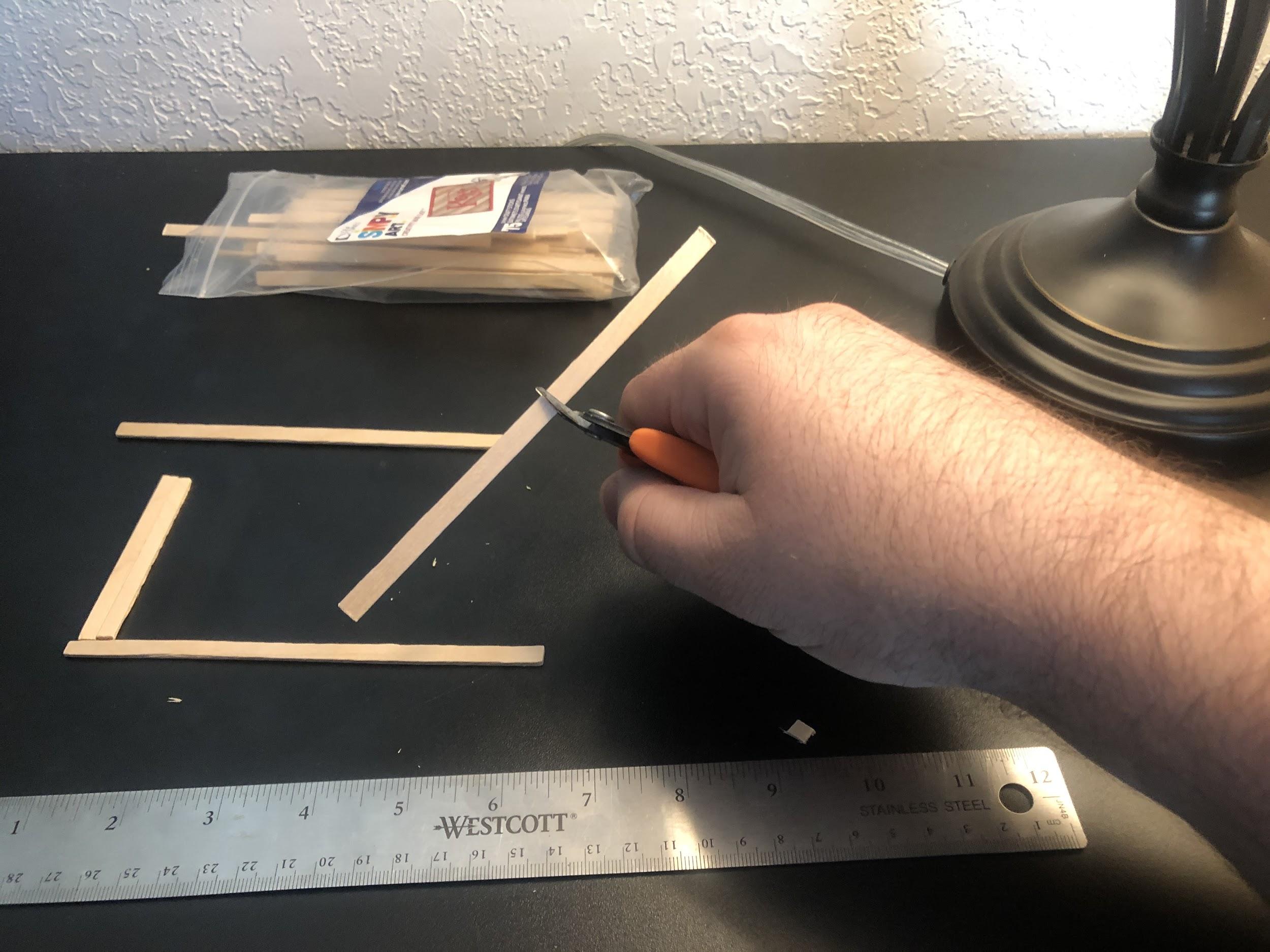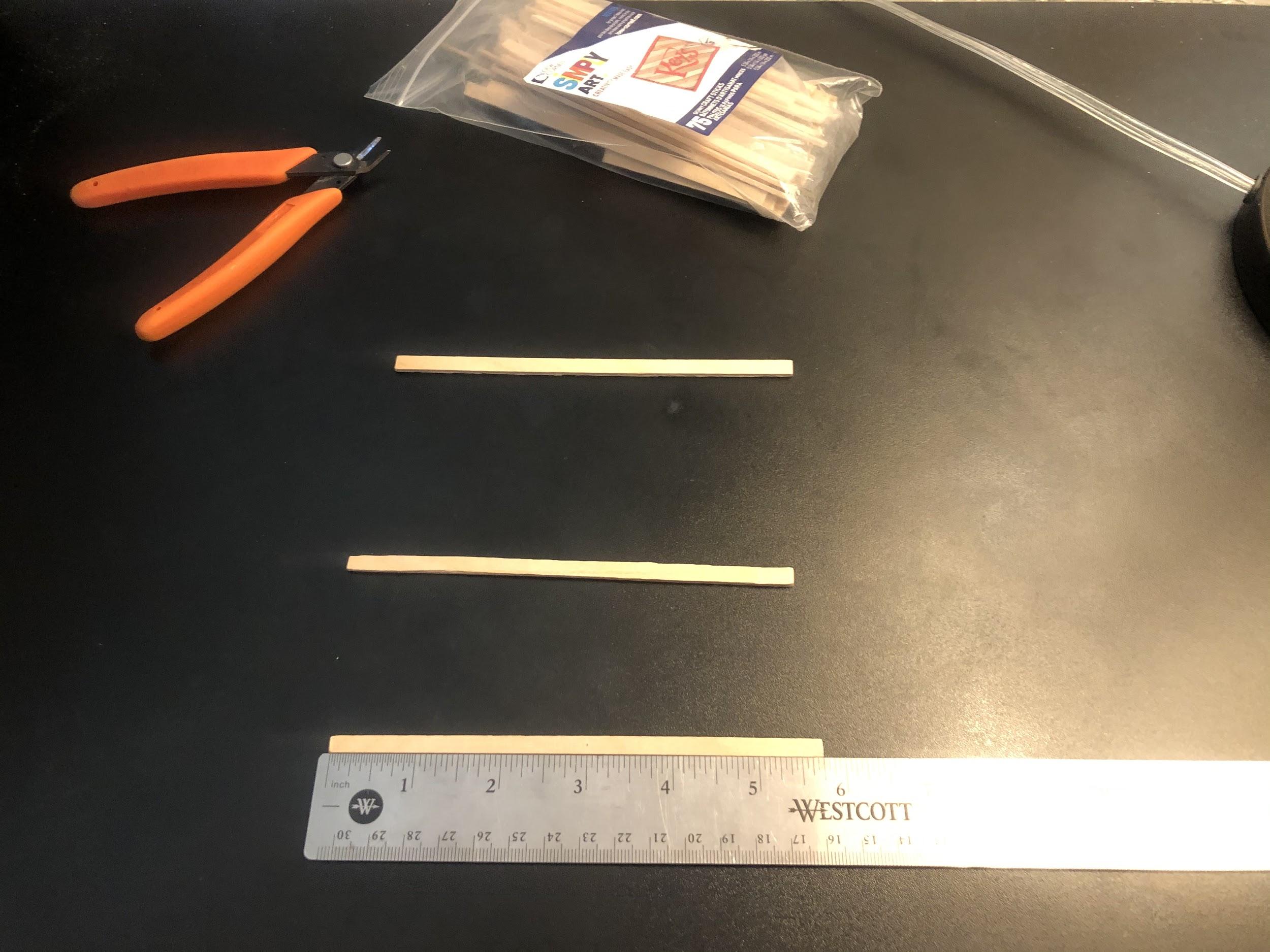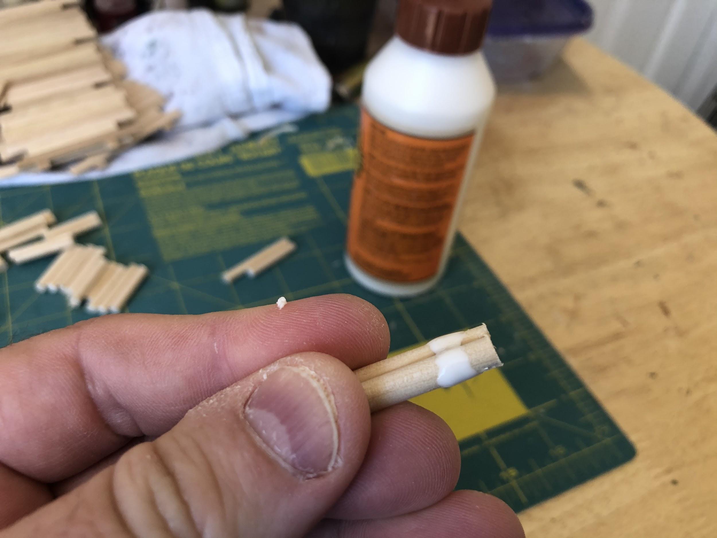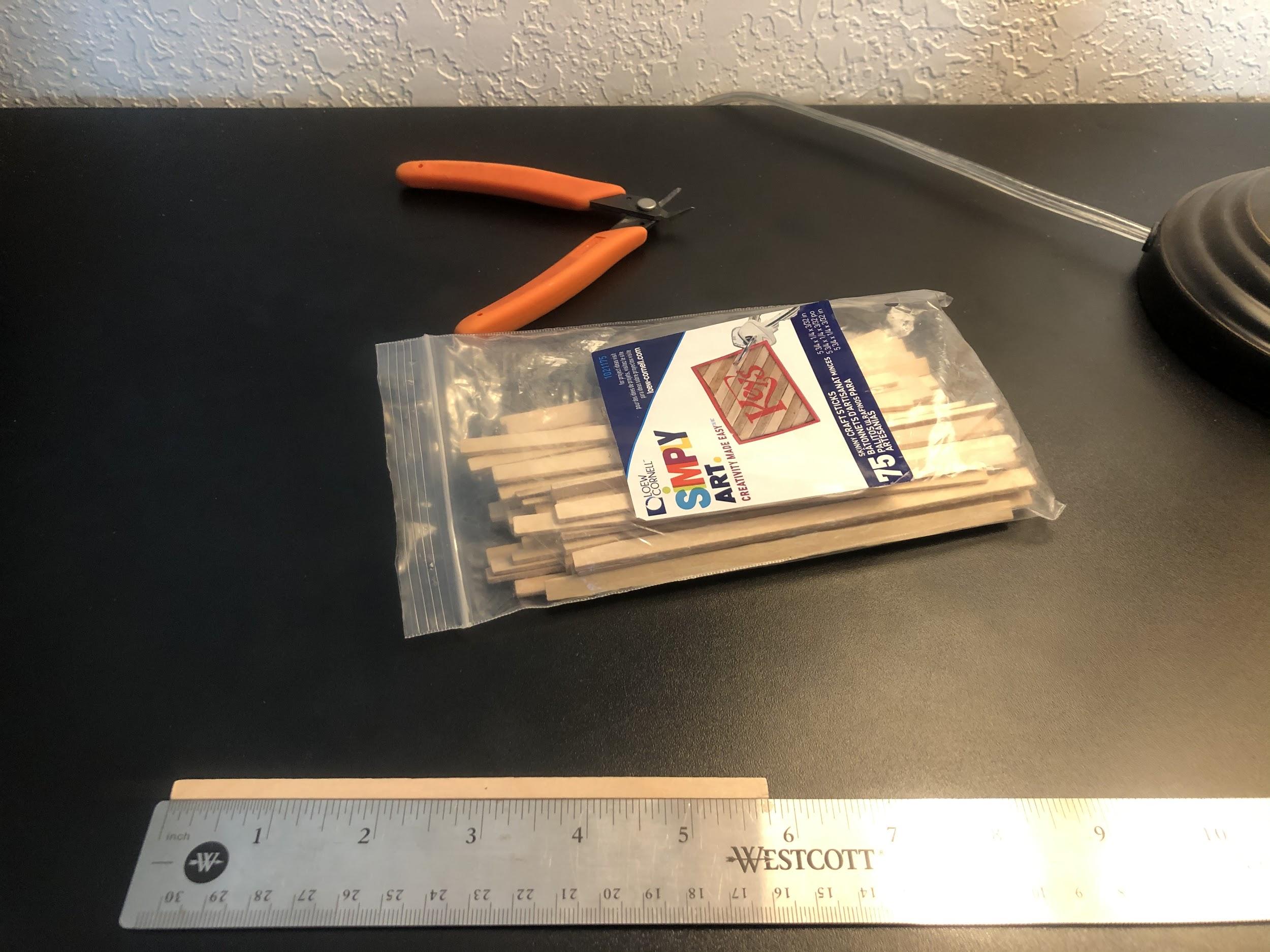 You need to assemble several basic supplies to make these. These are mainly constructed of something called “coffee stir sticks”; a wood stick, flat on both ends, about 5.5” long. For the posts I used ⅛” wood dowels for a double post look, but you can use larger dowels for a single, as long as the diameter of the dowel is not more than the width of the stick. You will also need wood glue. Here’s a picture of the type I used.