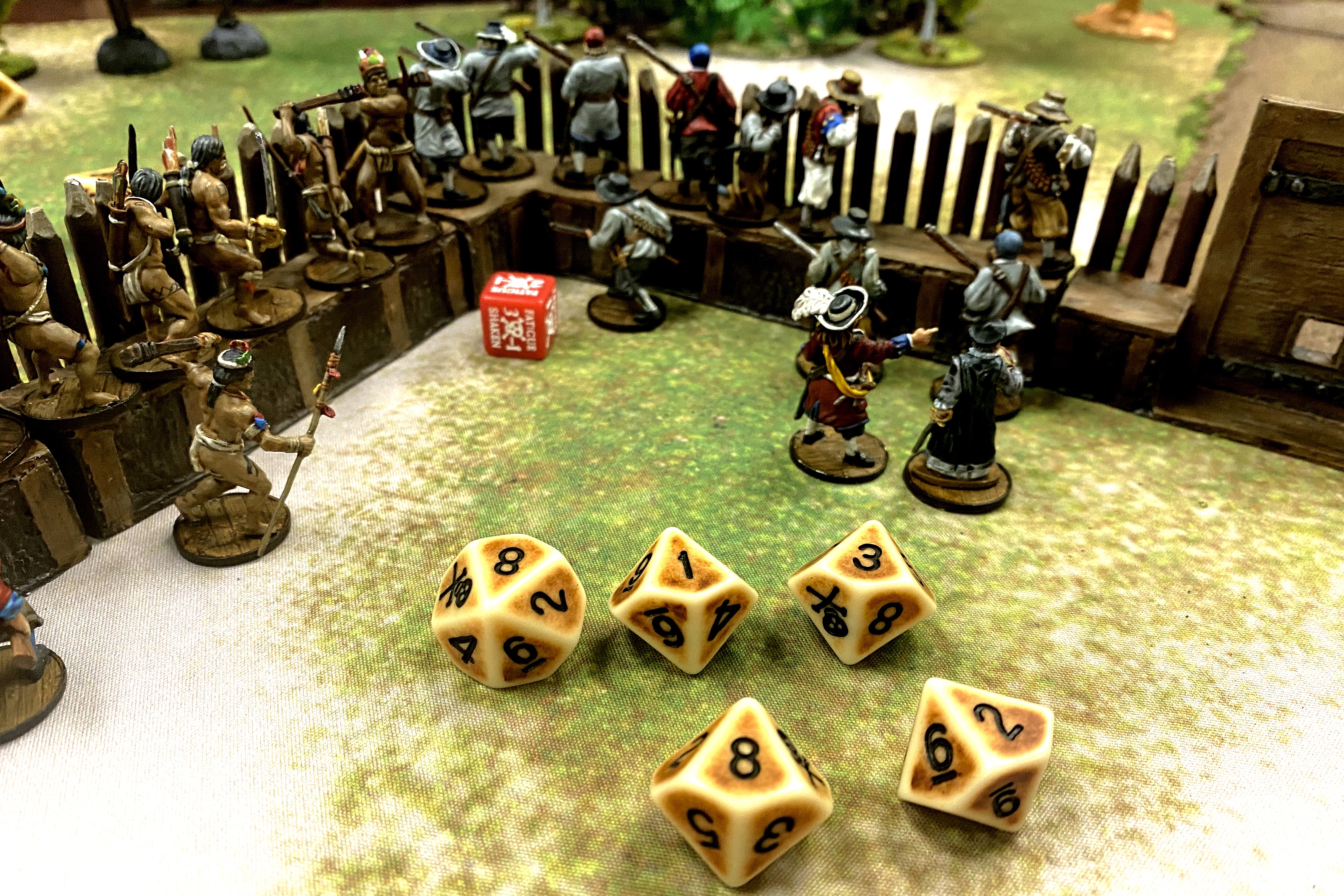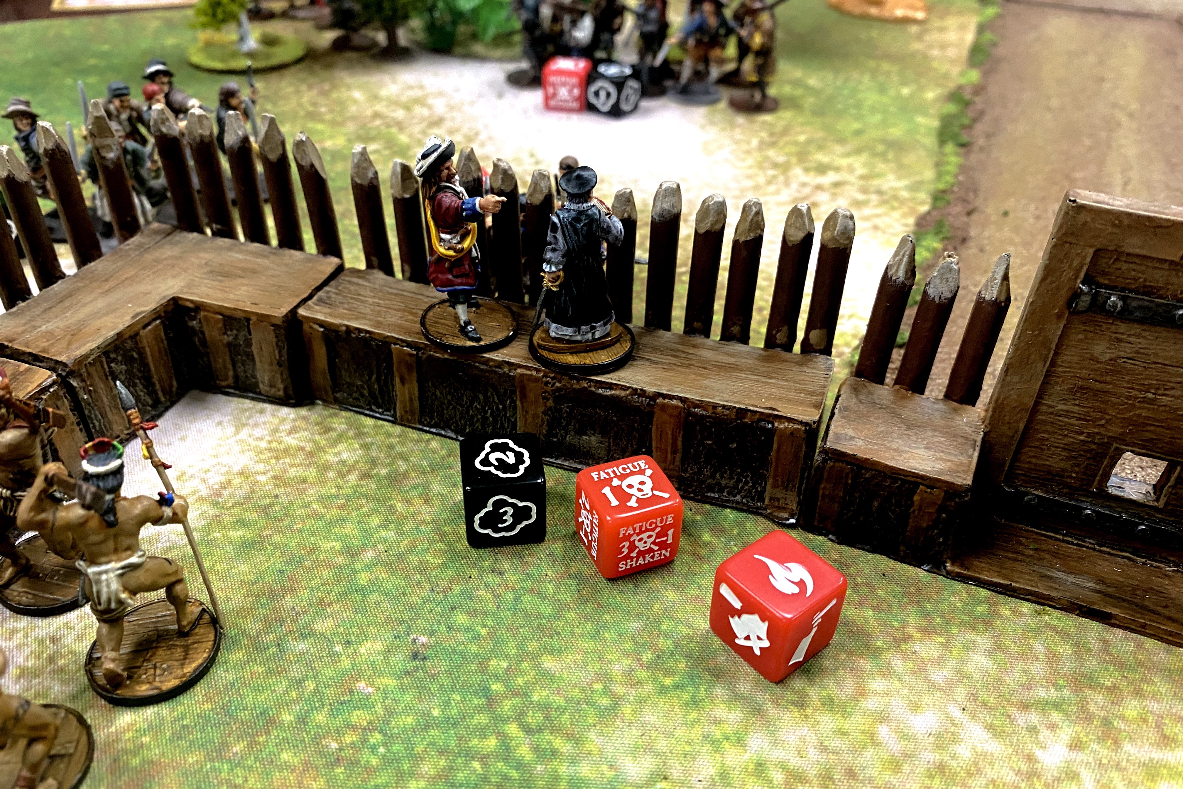 - I think Bryan had a good force for the job and a good basic tactic but Lady Luck had no mercy in this game. If he hadn’t blown himself up so much, and if his Firepots had done their job properly and set my fort on fire and if my commander had died like he should have, the game would have gone very differently. Just killing my commander would have seriously hampered my defensive efforts. Looking back I can speculate that putting some more fire down on the Sea Dogs might have been helpful so the cannons didn’t fire on men in the open so much. His list had plenty of options for vaulting over the wall with a good commander, an Officer and a Reformado. The large units with muskets supporting the brute squads made up a solid force for storming this kind of fortification. The Dutch just need some new dice!
