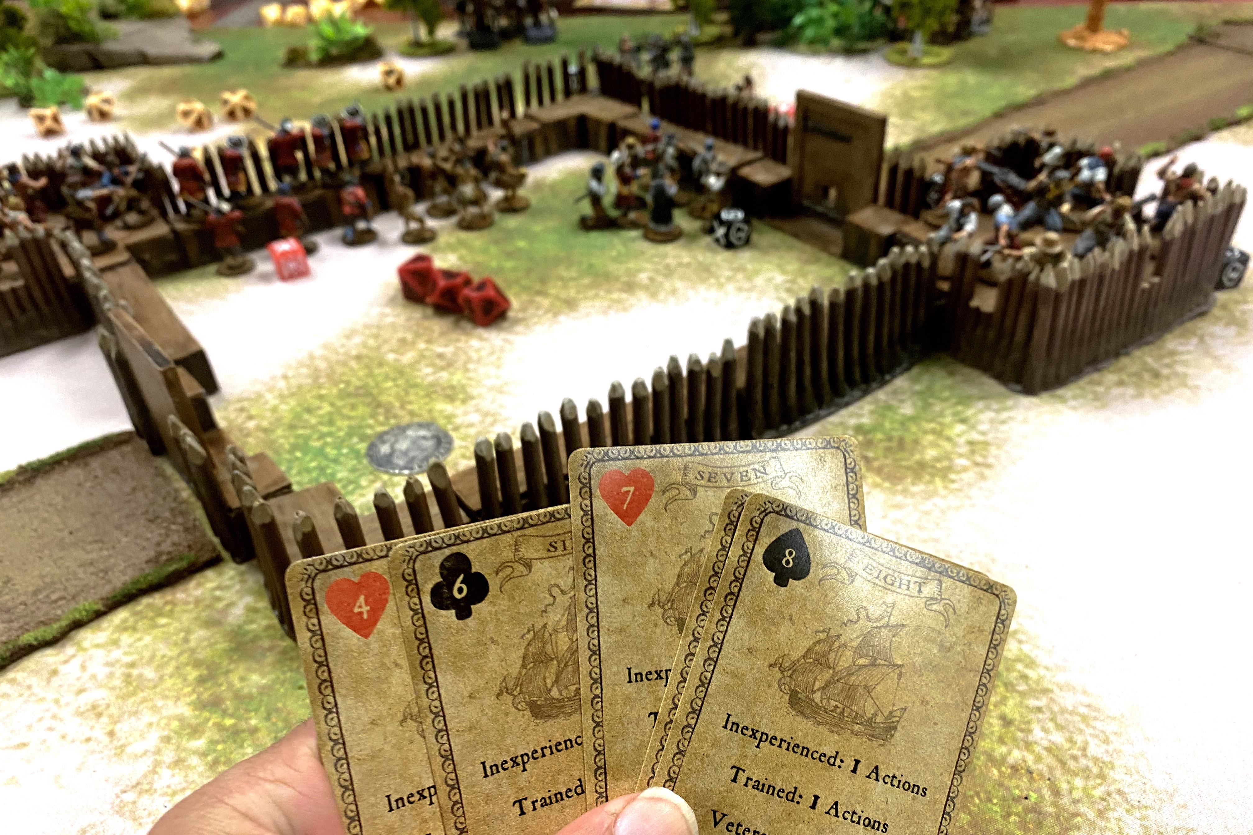 I was lucky to draw the 13 of Spades this round so I could get my poor commander out of harm’s way before he was destroyed. I used one of his Command Points on his own unit and they were miraculously able to put out the fire before moving off the wall.