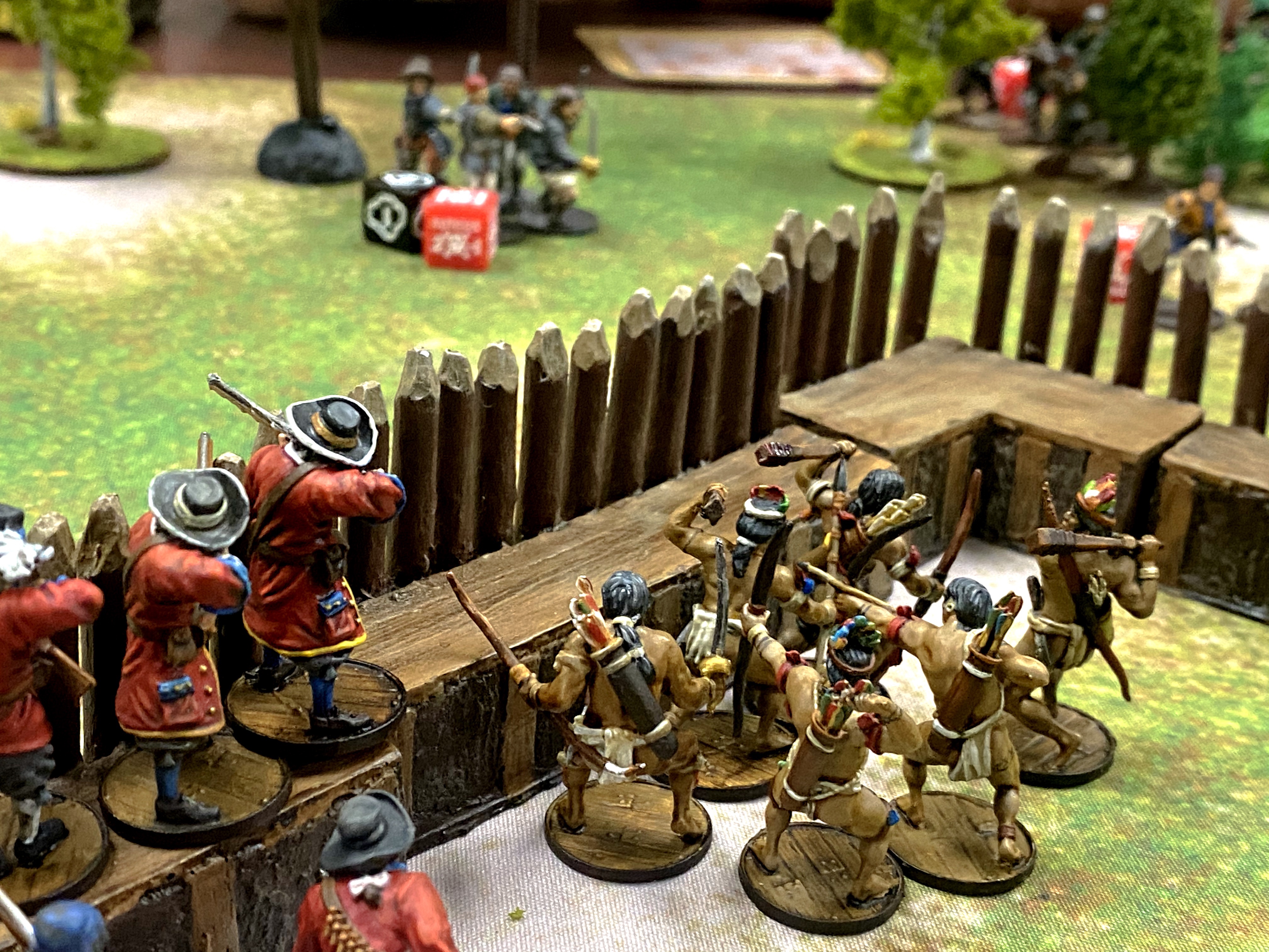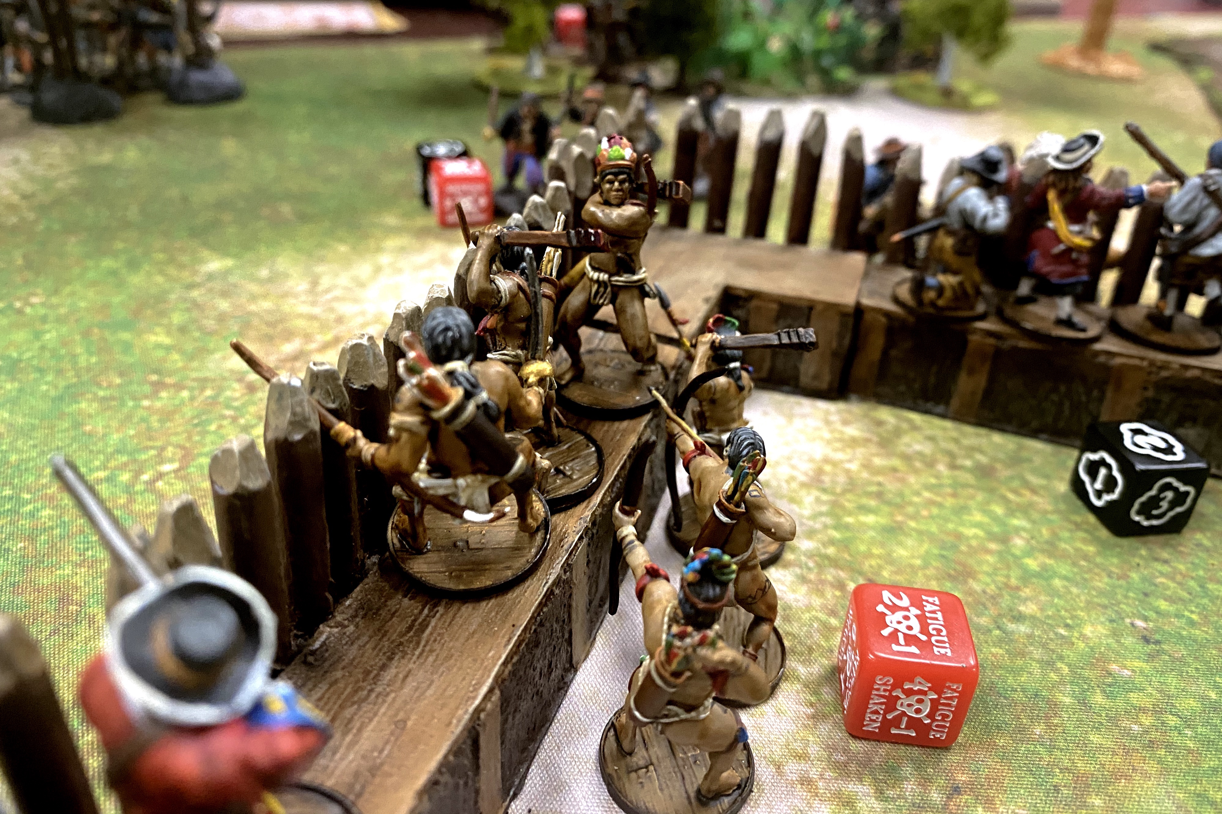- The Native Warriors were kind a surprise success in the fort. The game rules that allows the fort owner to clear any area terrain within 8″ of the fort means enemies don’t get decent saves as they approach, even against bows! Their ability to shoot fast and move on and off the walls so quickly made them really valuable. They have a great Fight score to they can counterattack if the enemy every makes it inside the fort and they have a good basic Shoot Save which is improved by the hard cover of the wall. I considered them a very valuable unit and it made my expensive commander feel a little more worthwhile.