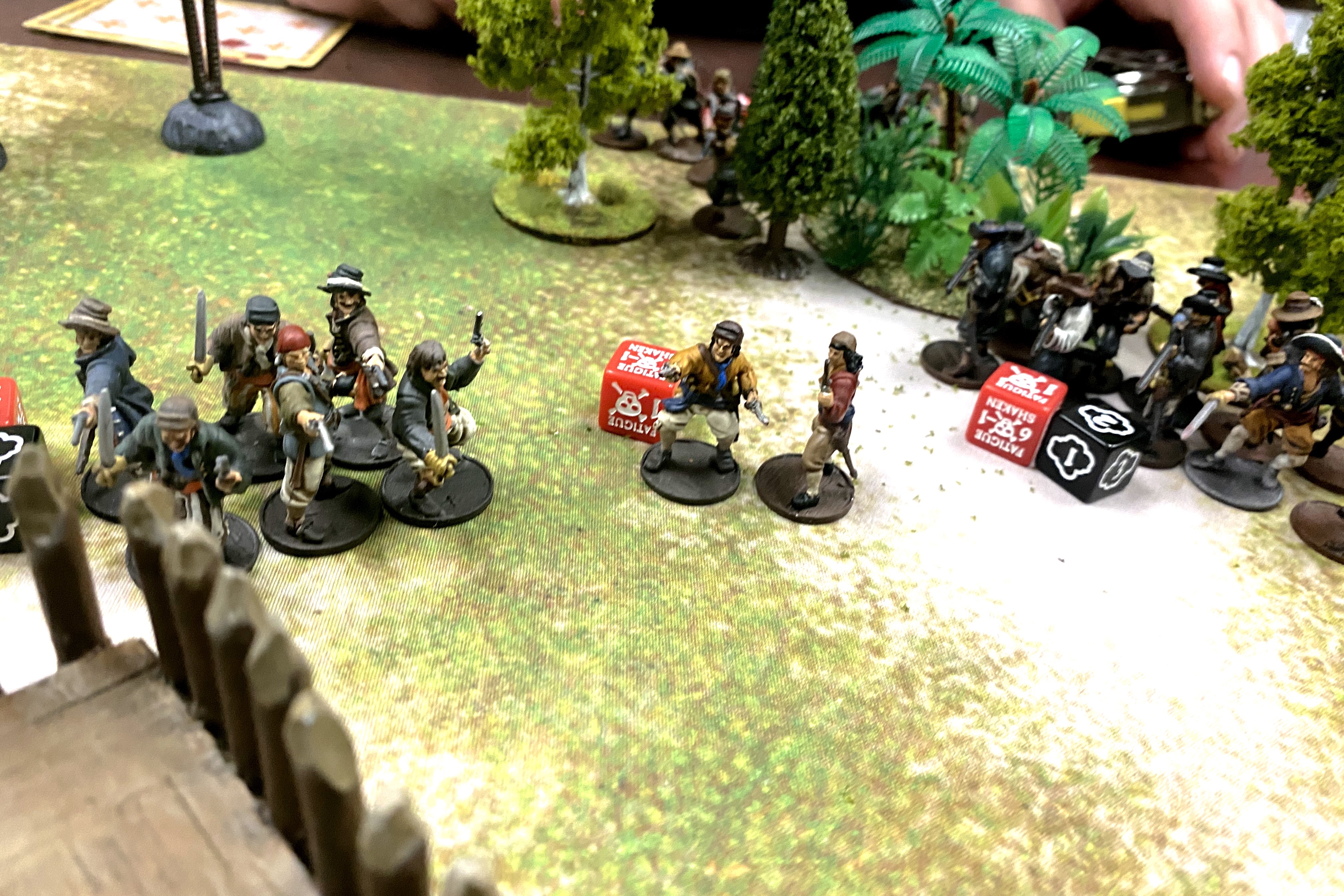 Then up came the second wave! The massive units of 16 European Sailors with muskets came on and fired a volley. The first volley missed entirely and a Fortune Point only increased it by one success! My command unit had no business still being on the table, let alone remaining unshaken! Whetstone got incredibly lucky.