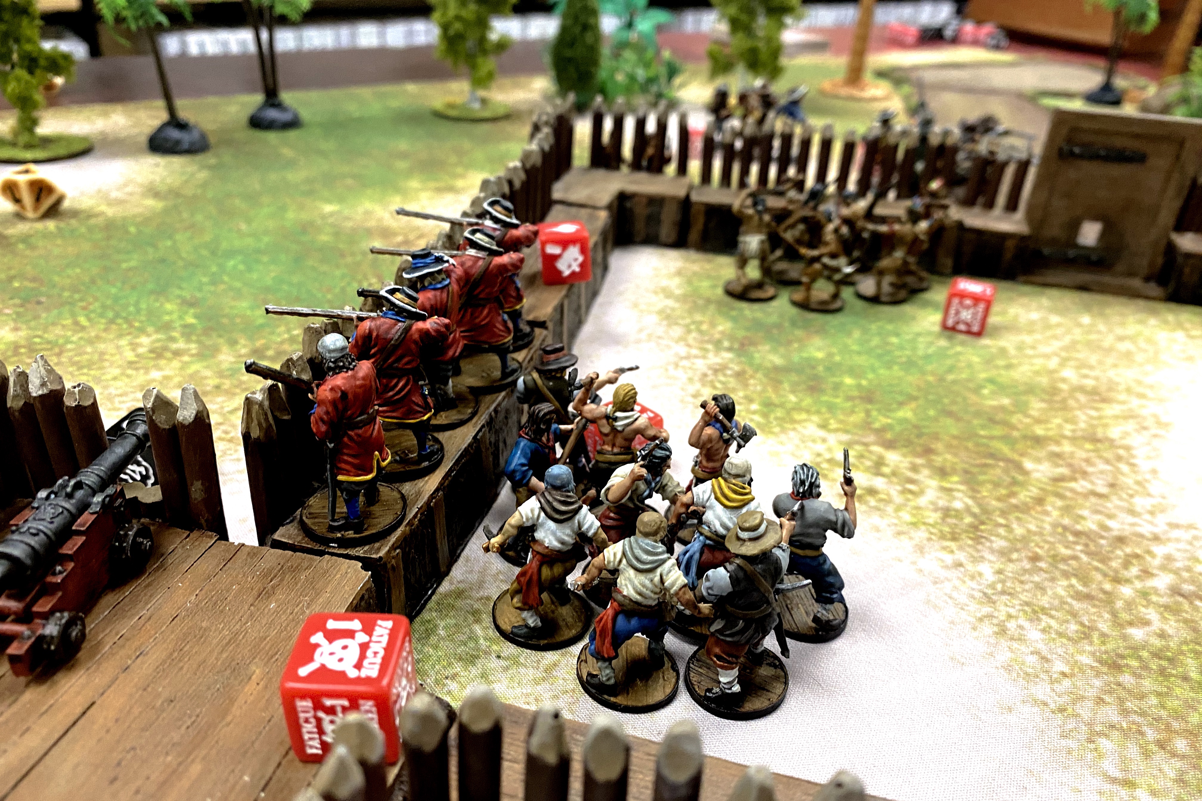 With all the action on the one side of my fort, I took the Sea Dogs off the far side cannons and moved them over to provide a melee counterattack if necessary. Even without pistols, 10 Sea Dogs with Brawlers is a decent melee force!