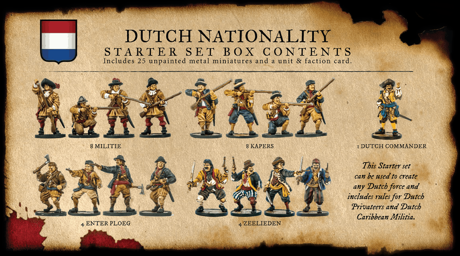 If sea is not something you’re interested in, there’s another bundle that will get you started: The Hard Plastic Dutch Nationality Bundle! This comes with a box of the aforementioned Sailors, a box of plastic Militia minis and a resin Dutch Commander Mini. While the sailors may seem useless for a land list, they make great artillery crew and love getting into melee with lances or a brace of pistols!