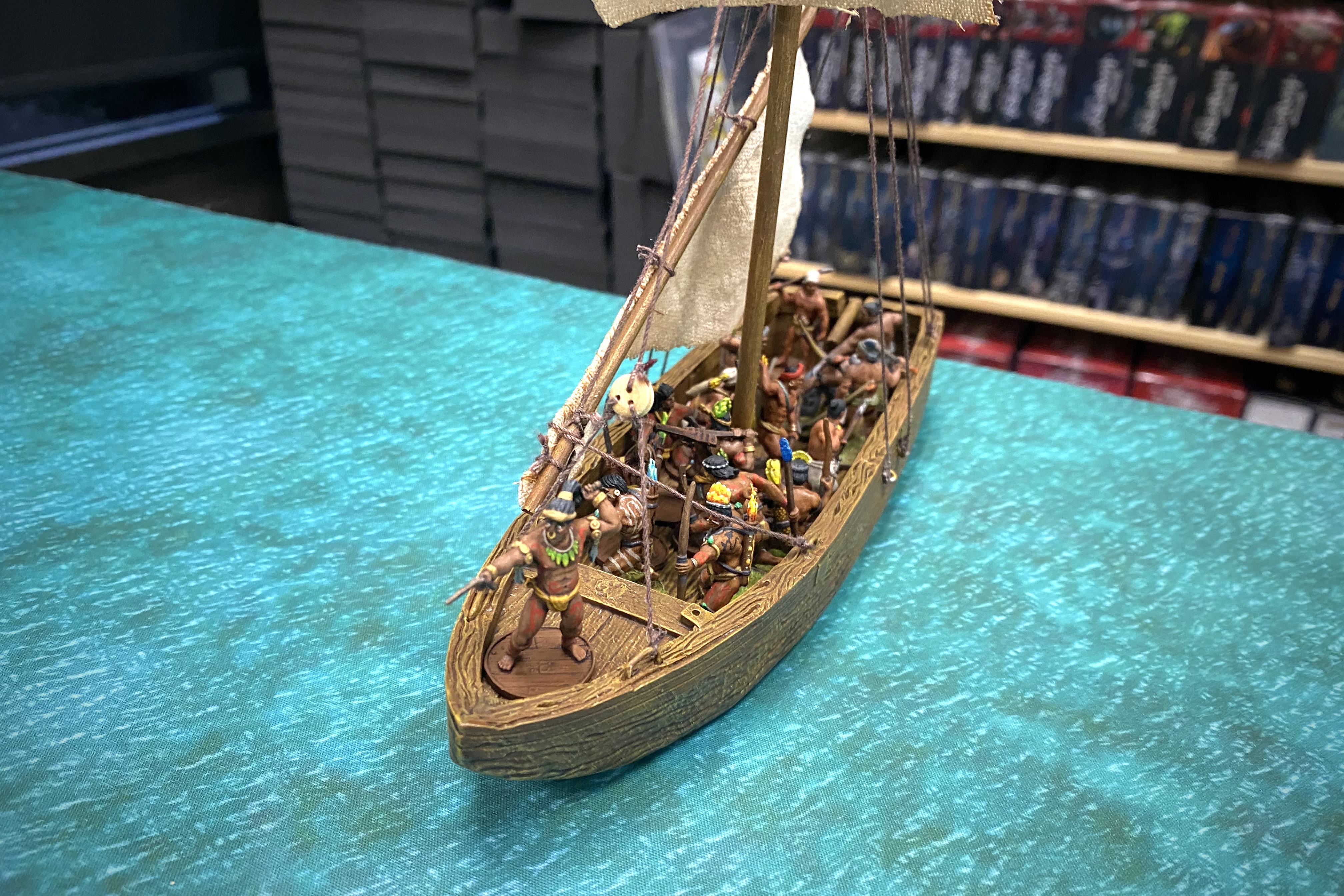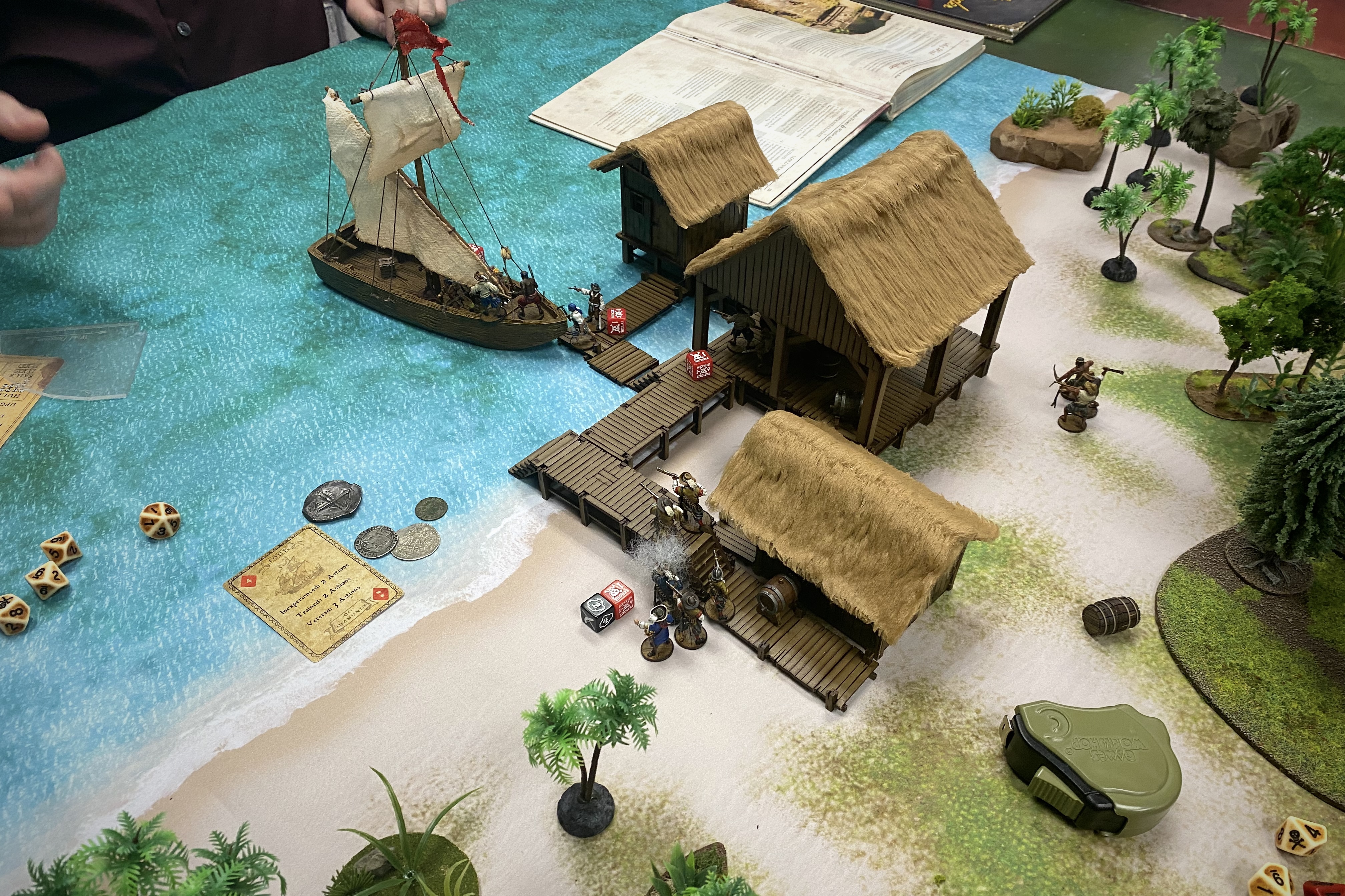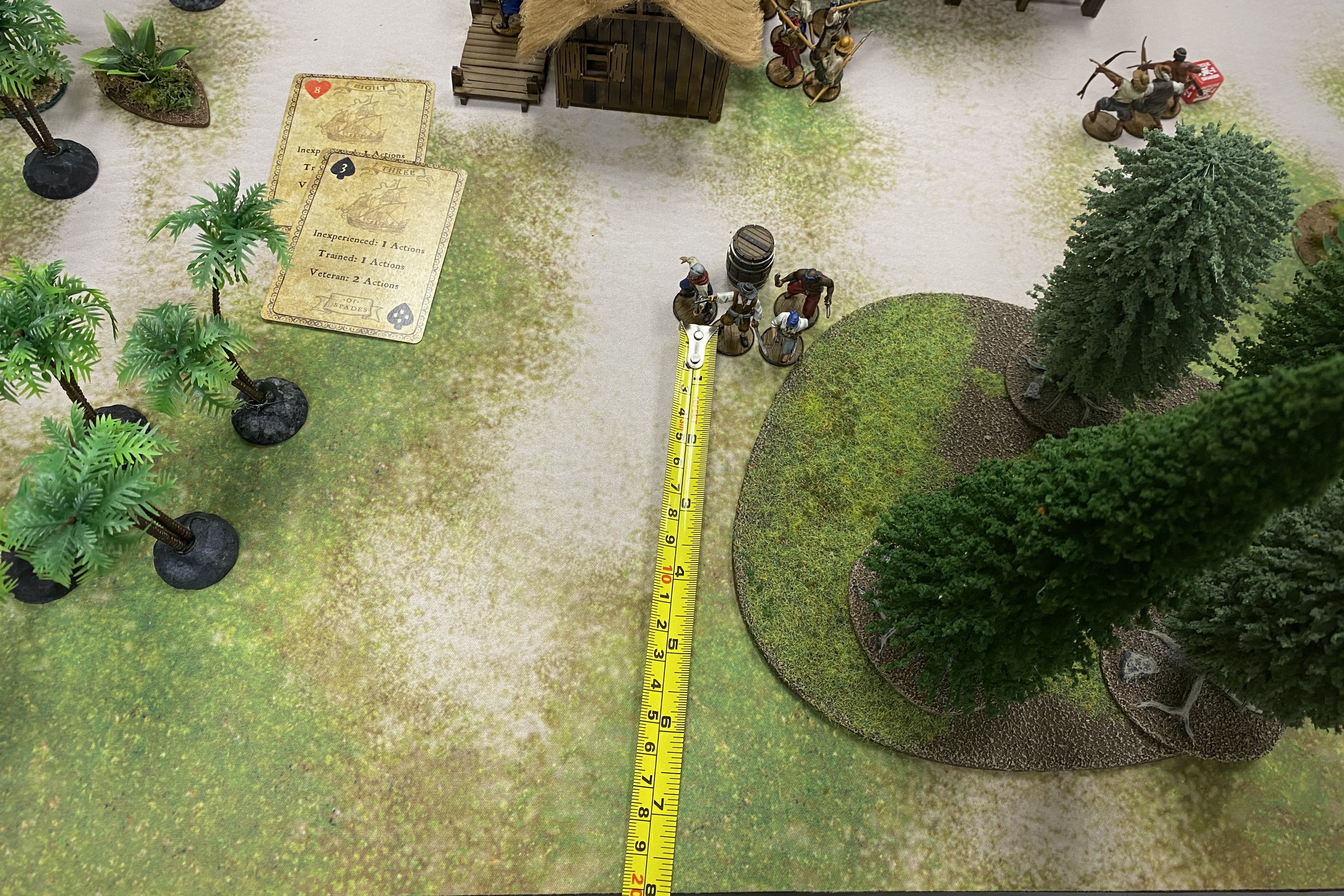 The Young Warriors moved out of the small warehouse towards the Piragua. With the 3″ limit of movement after you exit a structure and the requirement of being in base contact with the piragua before entering it, it was going to take the young Warriors 3 moves to get from the building into the boat, in spite of it only being 4″.