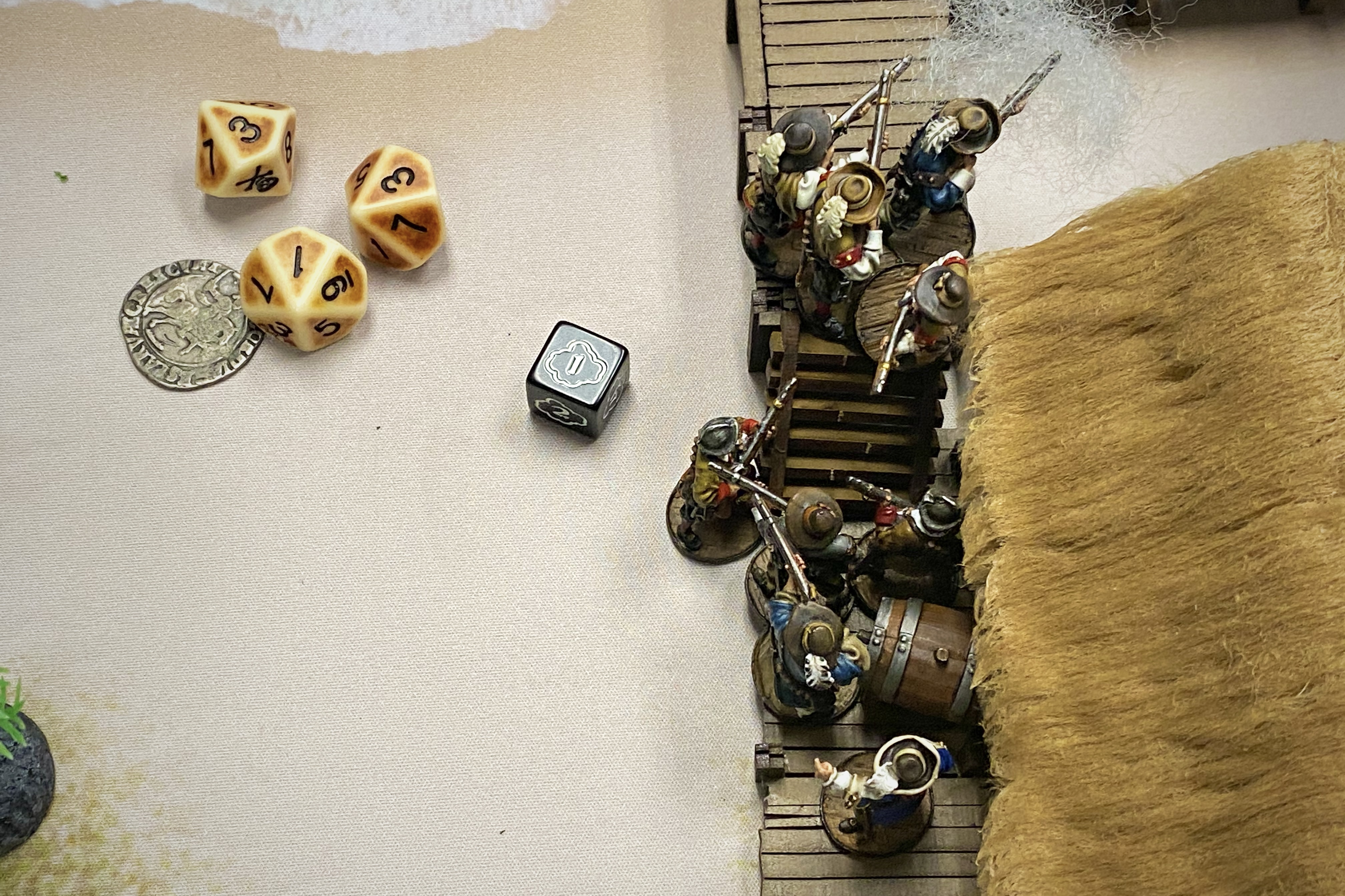 Guy took initiative on turn 3 and unleashed a deadly volley on my Milicianos. I failed all 3 Saves (from arrows!) so I used a Fortune Point to reroll but I failed them all again! I failed all my Fatigue dice as well and used a Fortune to try to keep them in the game but failed on all but 1.