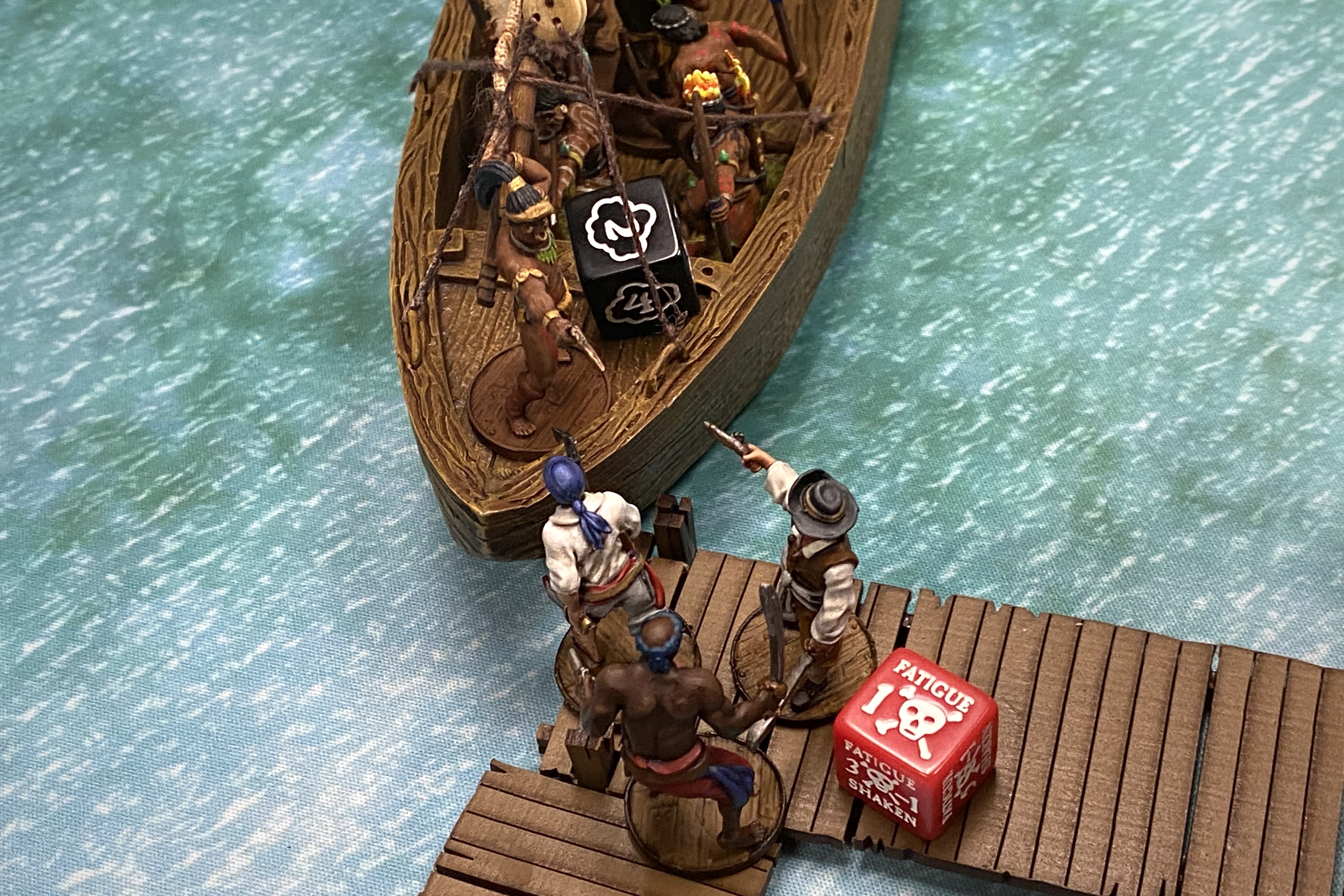 Ruthless applied to the Charge so the Spanish sailors hit on 4’s and Natives really don’t like getting hit with a melee attack. The went up to 3 Fatigue and were Shaken with no place to go so they took an additional Fatigue.
