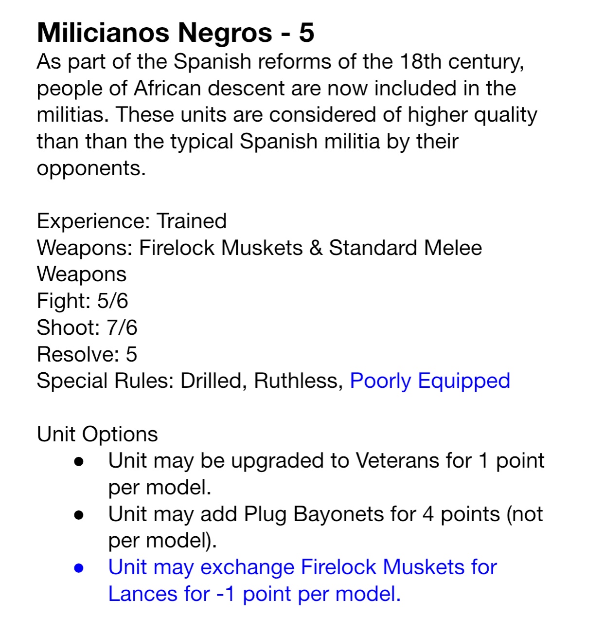 This unit is similar in a lot of ways to the Soldado de Avanzada but there are some key differences. The only different stat is the Shoot Save of 6 but that’s a big one! A strong Save is always appreciated! Their upgrades and modifications set them apart from the Soldados de Avanzada. You can even make them a cheaper Lancero by exchanging their muskets for lances. They don’t have Elusive like the Lancero but they do have a superior Fight Save. I have to say these new Spanish militia units are a breath of fresh air! This unit has 4 better stats than the basic Miliciano unit for only 1 more point (assuming the same training level).