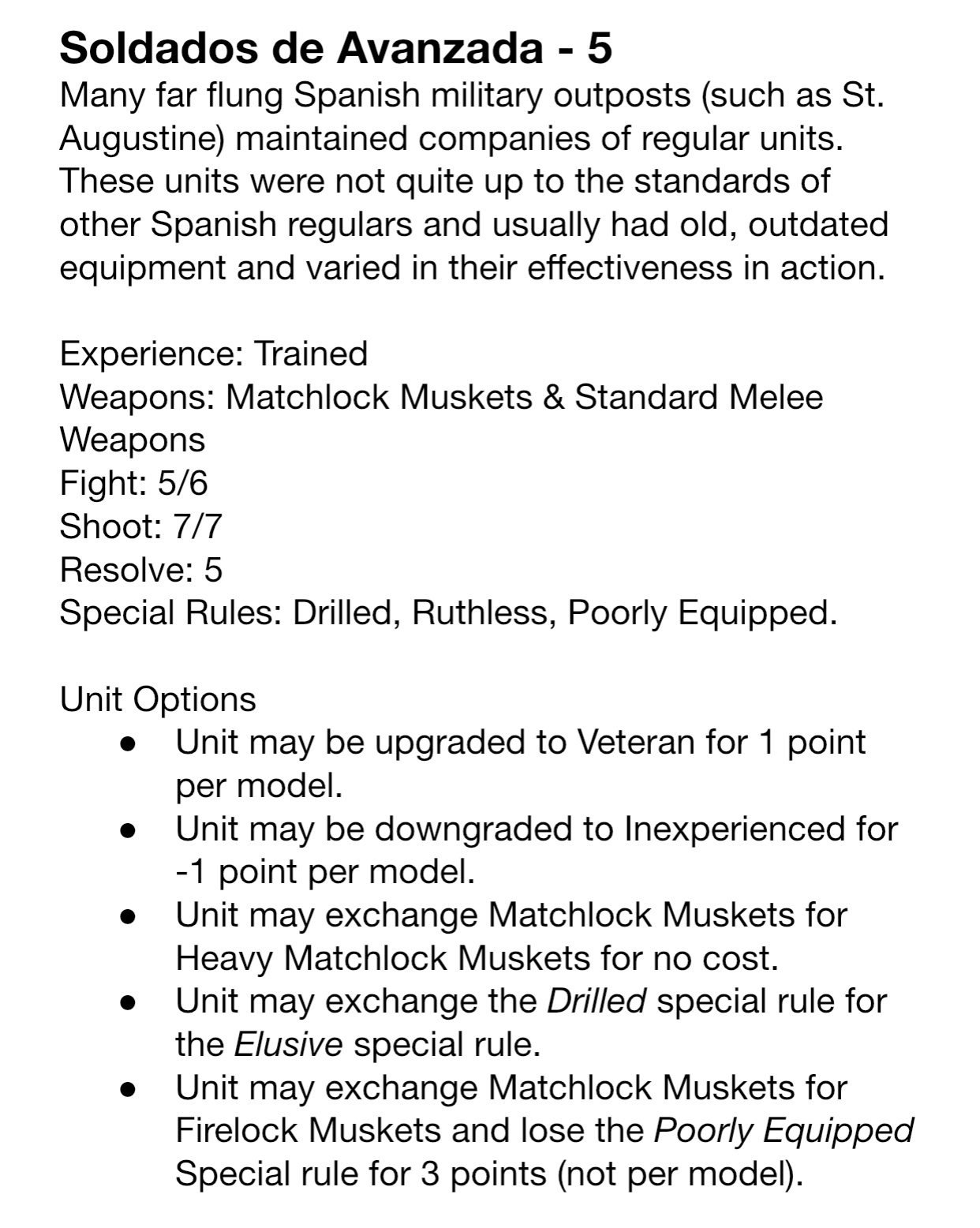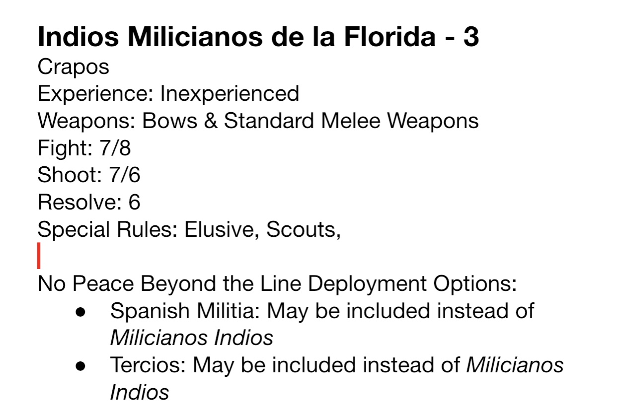 The last faction rule limits force building by giving the Soldados de Avanzada unit the Support: Milicianos Indio de la Florida rule. You have to take these new Indian militia units no matter what!