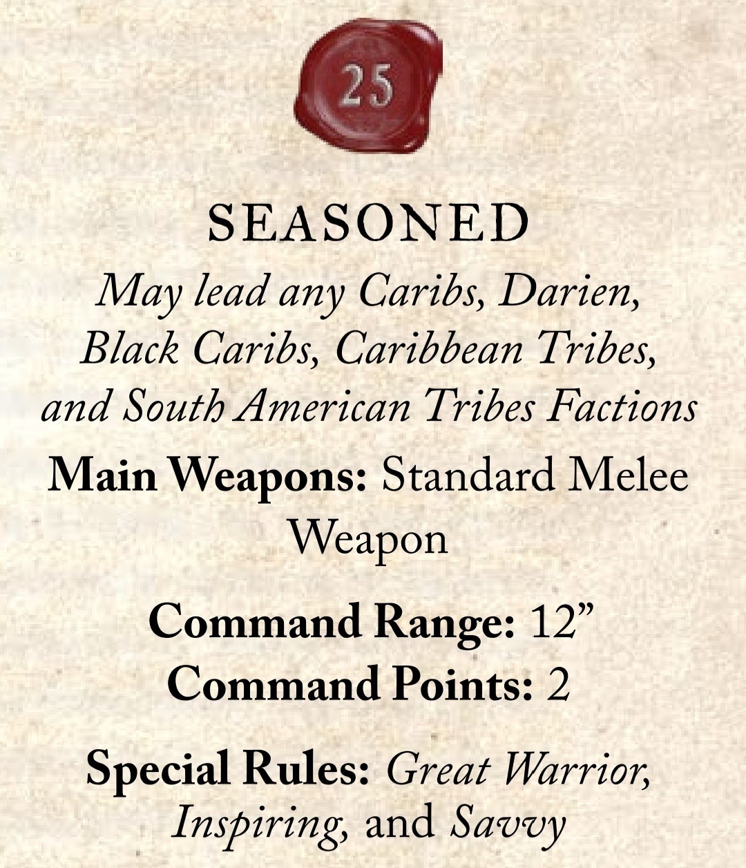 This untested commander is a lot alike other untested commanders. He has a single command point and a 4″ range. Like other generic Native American commanders he only has a melee weapon. Unlike other Factions, the Black Caribs will use this free commander in 150+ point games, usually because African Warriors cost 6 points each. I try to take Great Warrior on the command unit whenever I can. The boost to the African Warriors already good stats can make a difference, especially if your shooting arrows each turn.