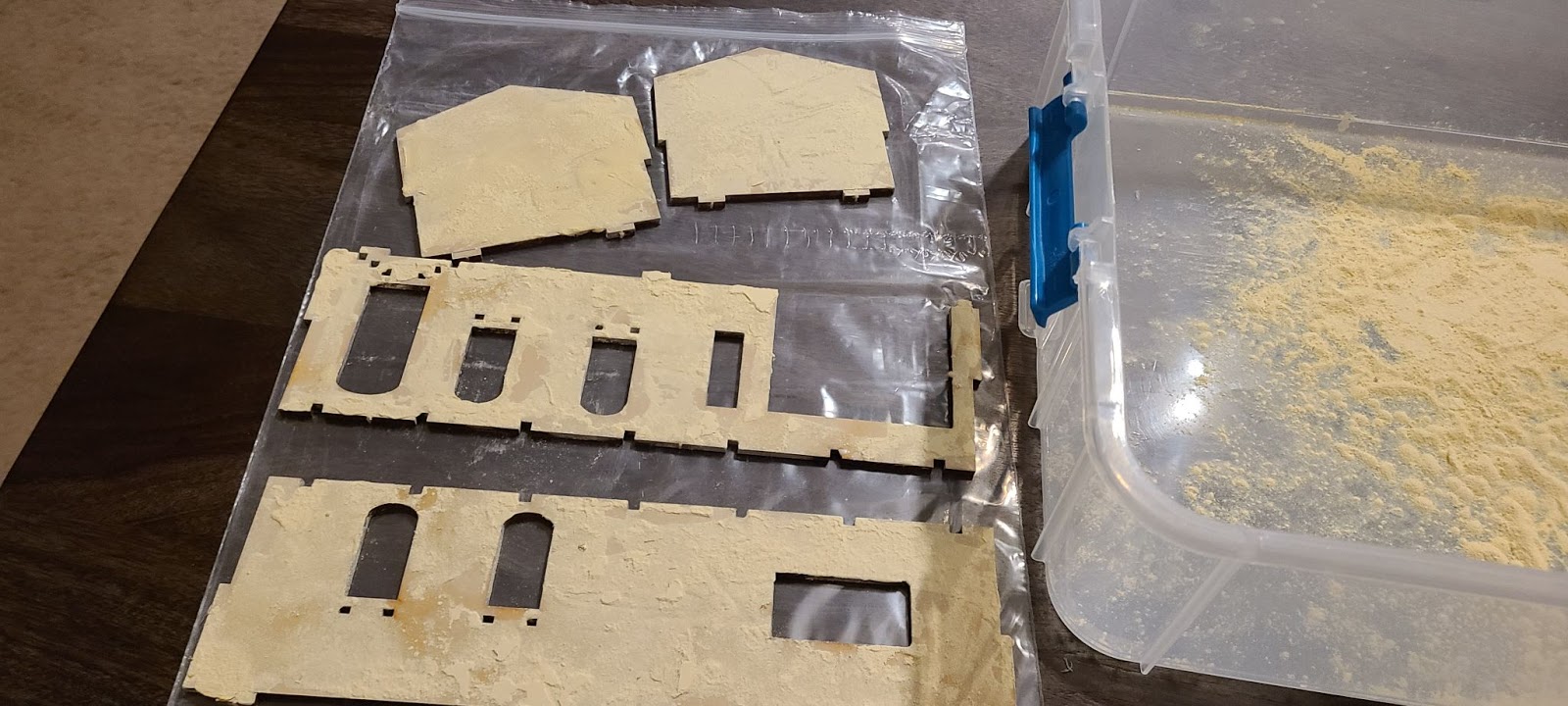 At this step I realized that I should have assembled the parts before putting render powder on them. Each wall segment is intended to be capped on one end by a brick pillar, and the pillar does not fit if it has any dried render powder underneath it.