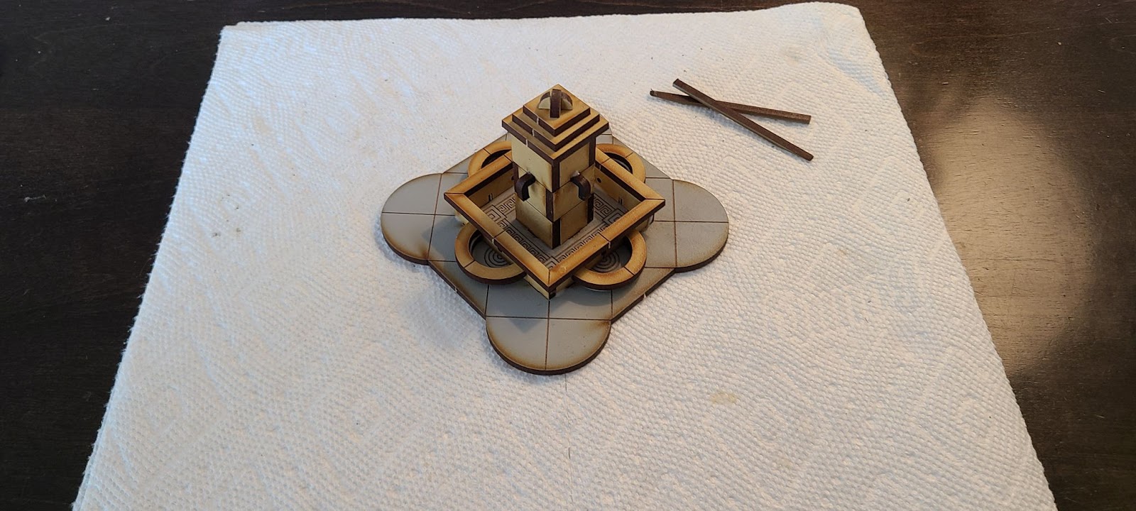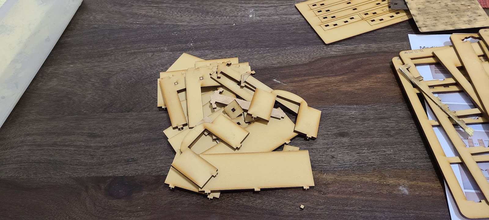This kit is on one sheet of MDF. At this point I felt I was a little spoiled by the crates, as each piece here has less etching and detail. It isn’t a deal breaker though, as the designers used the dark wood tones of the burn marks very well.