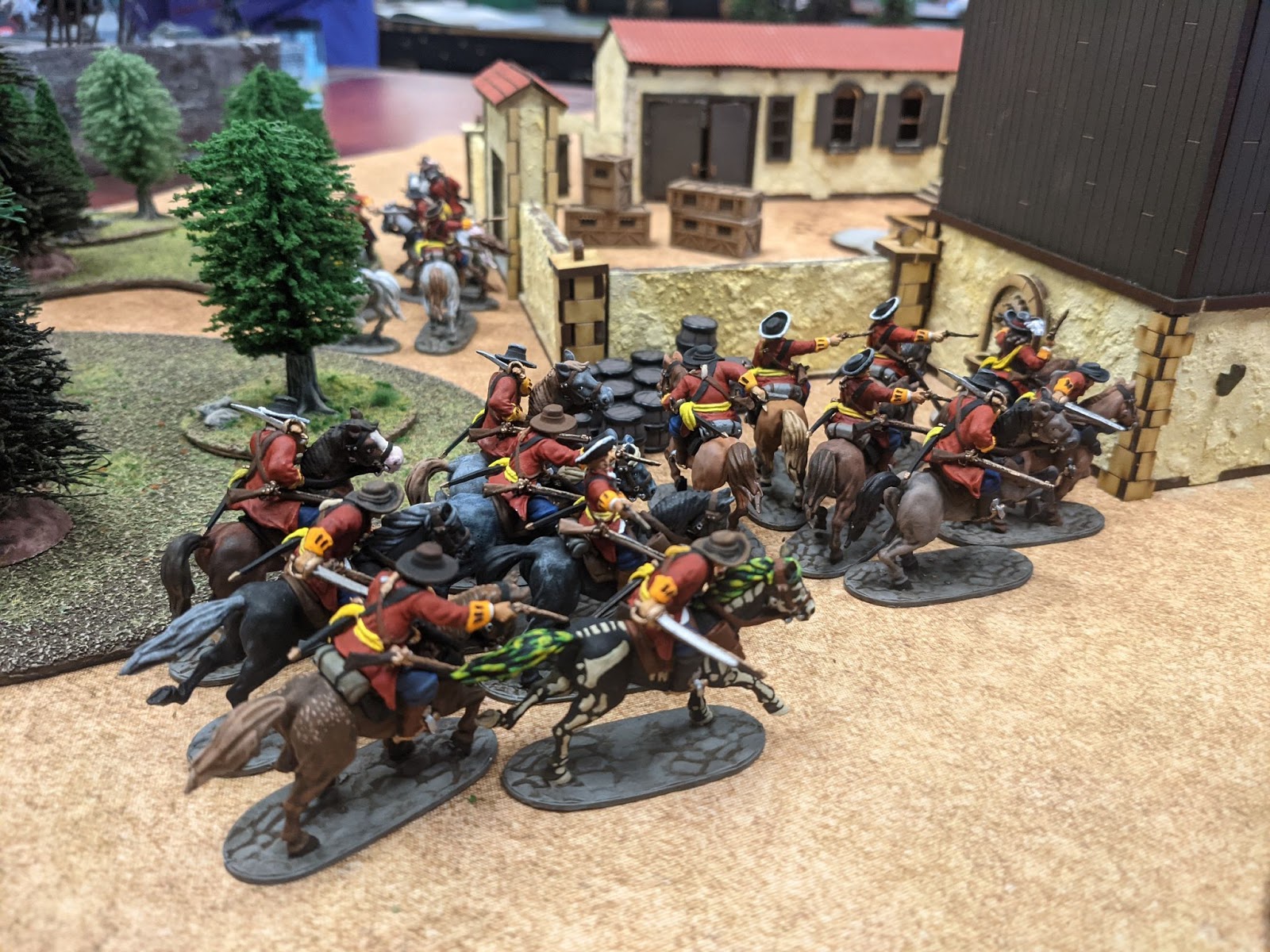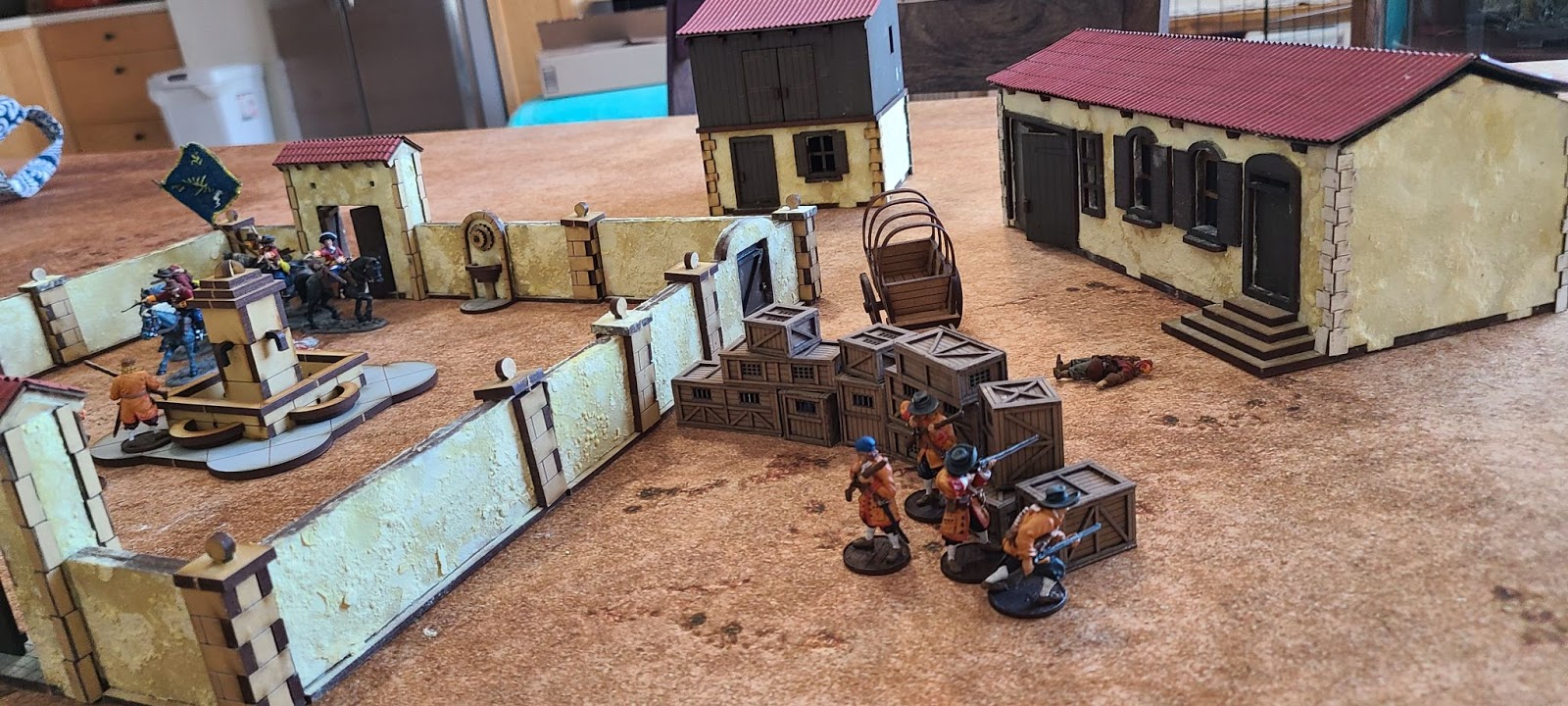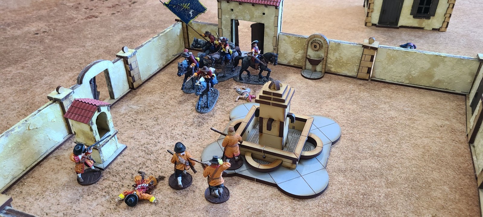 Here is the completed courtyard. It surrounds a huge space, and can really shake up the usual town fights by creating choke points, but letting crafty players break the choke points by climbing the walls or shooting into courtyard from bear by two story buildings.