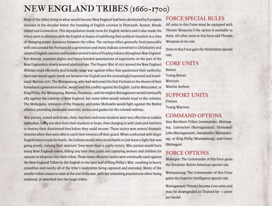 The New England Tribes Native faction features a mix of the new line of North American native models (see below) and the original line of “earlier contact” units like the Warrior Archers. With 6 possible units to build with, there’s a lot of variation possible! In addition to that variation, there are 3 force options, representing 3 of the primary powers active in the struggle: the Wampanoags, the Narragansetts and the Mohegans. Each played a very different role in this brutal war and there are small unique rules to reflect that. The Wampanoag had a long and close relationship with the New Englanders, going back to Massasoit’s assisting the Plymouth in it’s earliest days. The Narragansetts were numerous and powerful, but they lived further from the colonies. The Mohegan actually sided with the New Englanders when war broke out and were essential allies, familiar with both the Native locations, habits and tactics.