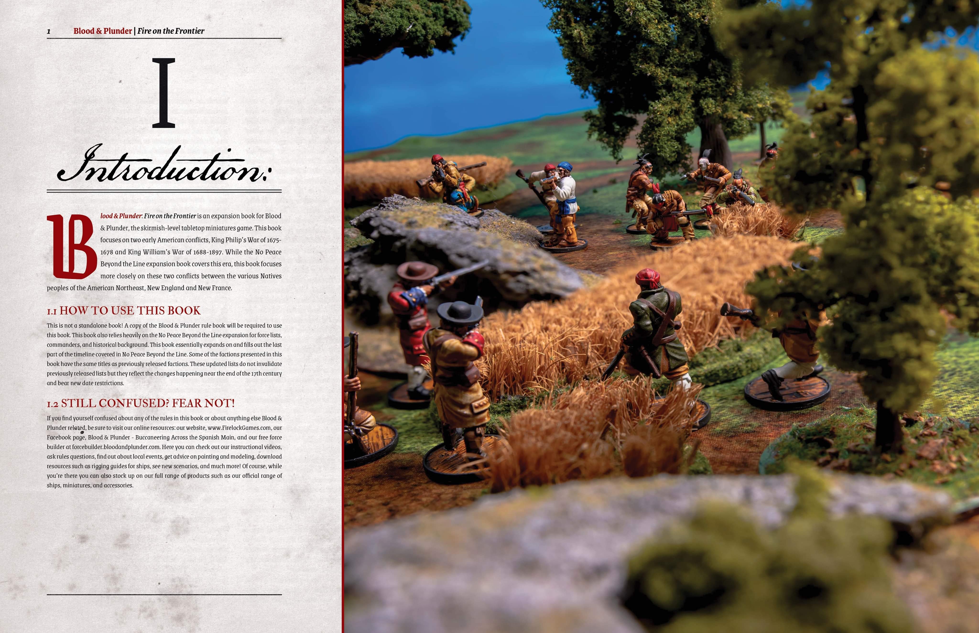 The center of this new set of releases is a new book. Fire on the Frontier will be a smaller rulebook (about 80 pages) that focuses on two late 17th-century conflicts in North America: King Philip’s War and King William’s War. This book focuses closely in on the late 17th century, specifically King Philip’s War (1675-1678) and King William’s War (1689-1697). No Peace Beyond the Line’s wide time frame technically covers that era, but this zooms in closer on these two conflicts.