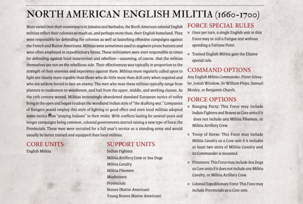 Representing various English forces in North America in the last quarter of the 17th century, this updated faction has some key differences, not the least of which is a brand new unit! The semi-professional Provincial unit should be a great addition to English Militia forces! At 5 points, this unit boasts stats much superior to the English Militia model that has always struggled with….dying…