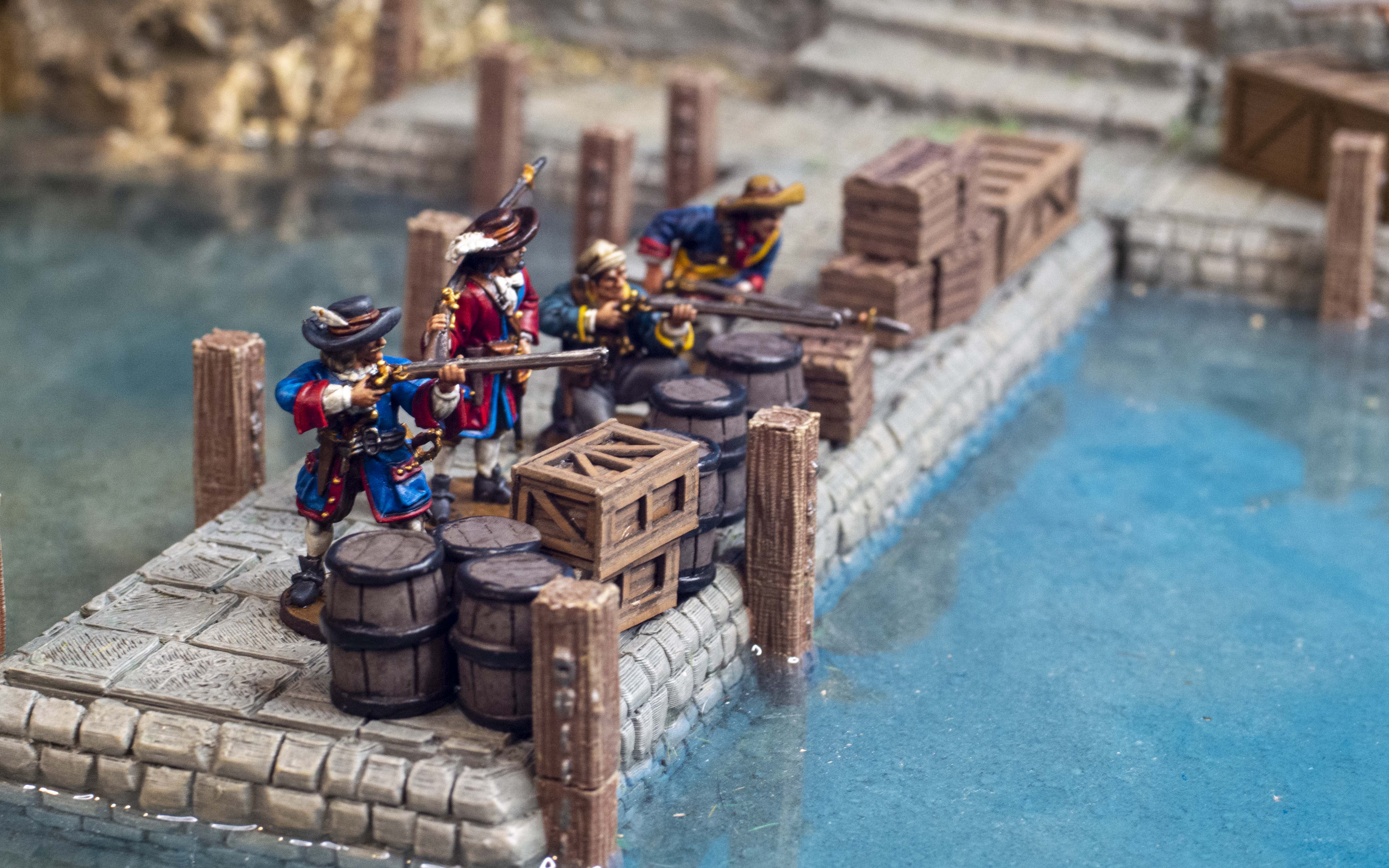 This list has grenades, marksmen, hordes of militia, swivel guns, brace of pistols and almost everything you could want! The sloop should mitigate the Misfortune at Sea rule. You will be outnumbered in most cases in a 200 point game, but you have a lot of small arms fire to try to suppress cannon crew that might batter your sloop.