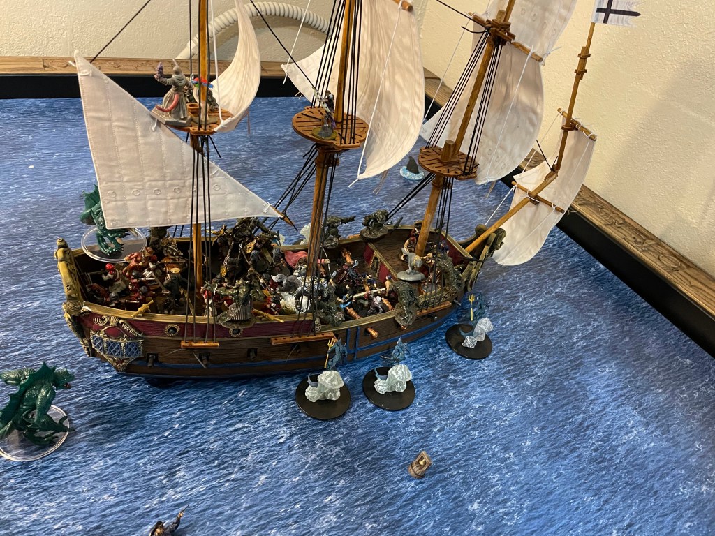 For terrain, the nice thing about sea battles is they mostly take place on (you guessed it) sea so terrain needs are more limited than most D&D locations. You will need some good ocean mats, and probably some scatter for islands or reefs. Tablewar has some great maps and feature scatter here. There is an entire section of Pirate themed terrain suggestions on this blog.
