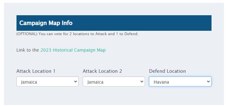 Long Answer: When you make an entry, you have the option to select 2 locations on the campaign map to vote to attack. Whichever two locations get the most votes, your nation will receive 15 extra points to add to any attack that your commander launches against those locations. The same idea applies to defense for one location.
