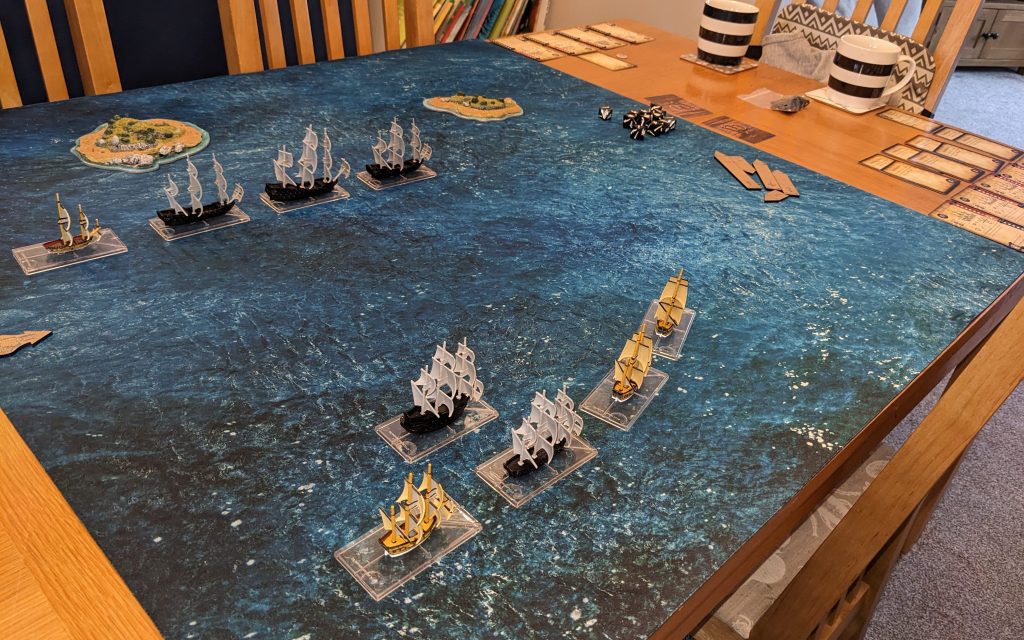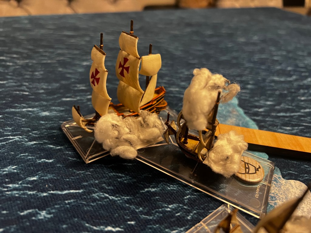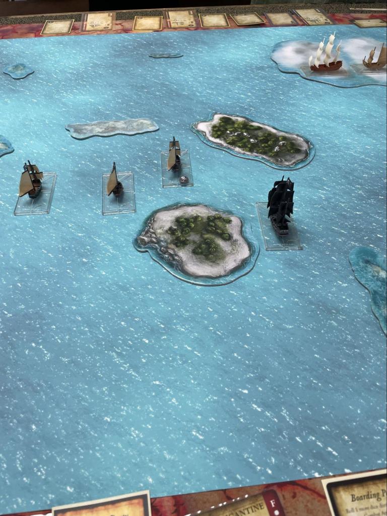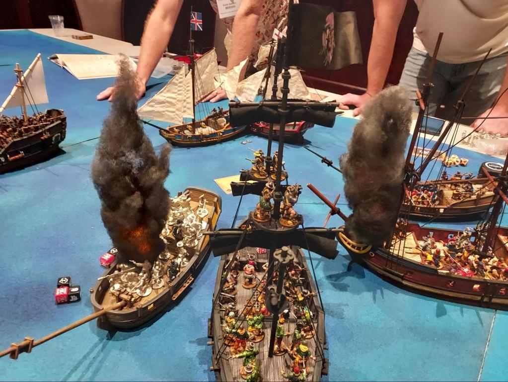 A small fleet of pirate ships clashed fiercely with English Naval warships. Outgunned and outmatched, the pirates were on the verge of being overwhelmed. Amidst the chaos, a mysterious fog rolled in, briefly obscuring the combatants from view. The eerie atmosphere seemed to have a profound effect, momentarily halting the fighting on both sides. Taking advantage of the English hesitation, the pirates slipped away into the midst.. When the fog cleared, Boston remained securely in the grasp of the English. (English 220 vs Pirates 145)