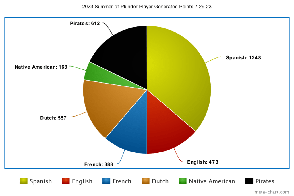 Welcome to the Week 8 update for the 2023 Summer of Plunder. We had another 159 games entered, bringing the total to 1,270 games logged so far this campaign! This week saw lots of participation in the weekly objective to use Native units in forces, along with a little boost of the Native American forces in general. Spain further solidified its lead in both player numbers and the campaign map, while all other nations seem focused on fighting for second place.