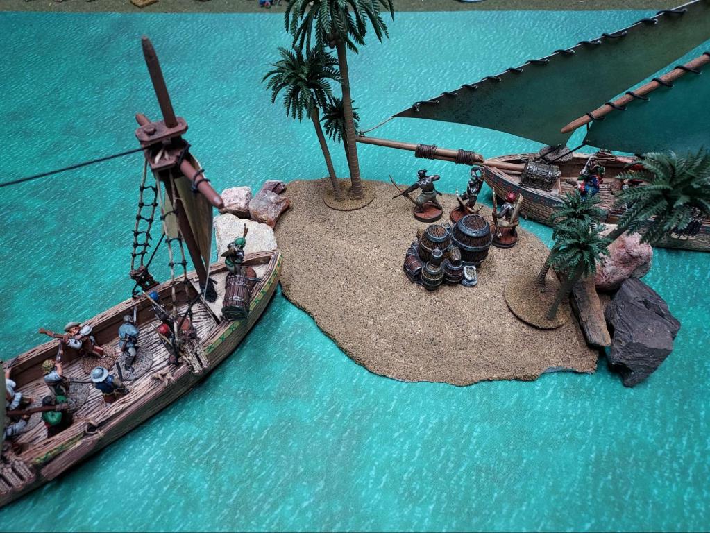 - First up, as mentioned in the “Call to Arms” at the beginning of the campaign, will be for the most victorious (top scoring) Pirate Captain, They will be rewarded with an Exclusive Pirate Captain model of yours truly, “Don Gregory de Padilla” and his card. I painted up this bad boy for the B&P painting contest they had prior to campaign start. The model came from the Pirates of Legend plastic box set with a small mod (bottle). In addition you’ll get a 3D resin printed set of scatter terrain (barrels, crates, etc.).