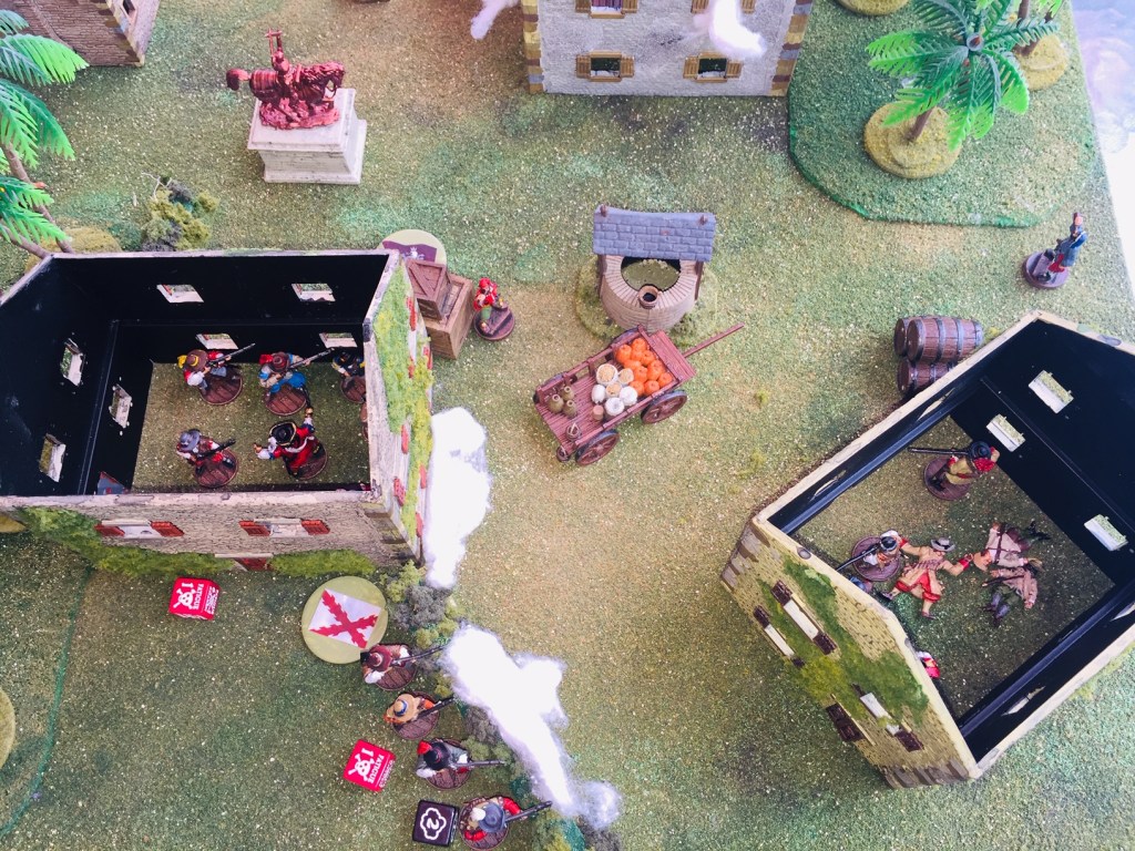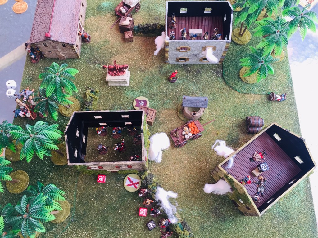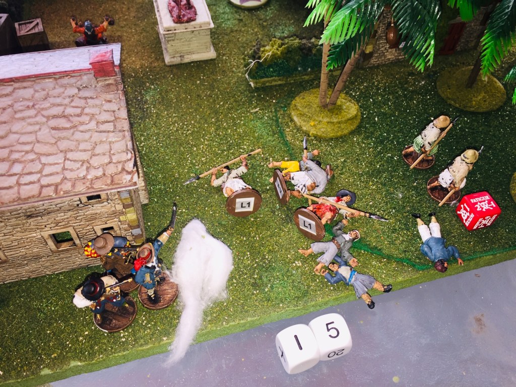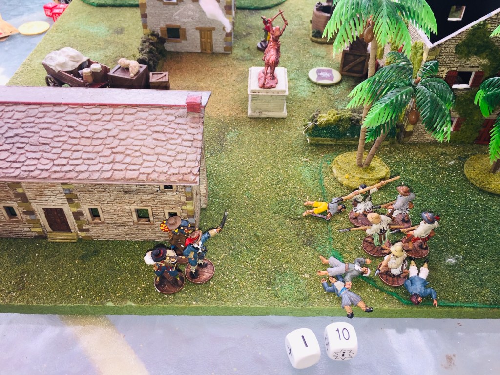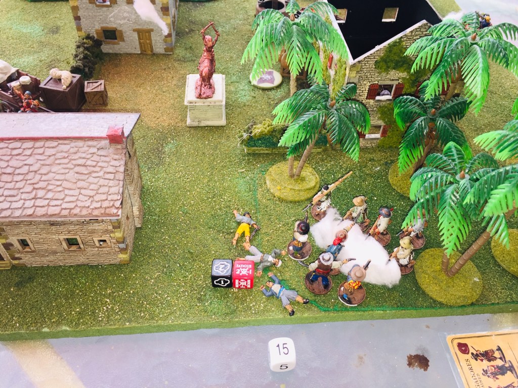 Musketry exchanged with the public house Spanish Hostigadores losing three men, mostly from the effects of ale and rum but some had bullet holes. Morale fails, or the rum casket found empty, therefore the Hostigadores bolt, with command, out the back door. The morale boosted Kapers counter-charge the fleeing Lanceros back into the palm grove, but both sides just miss their landed blows till next turn when the last of the Lanceros disappear.