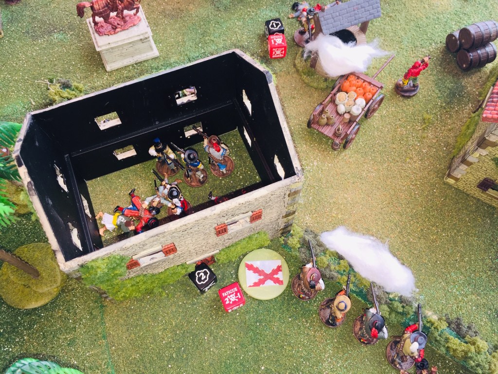 After moving two drunks, one has passed out, the cloud lighting remain the same at 10″. Seeing no rum barrels outside, and a great commanding rally roll, the Hostigadores re-enter the public house to hold their position from Dutch raiders outside.