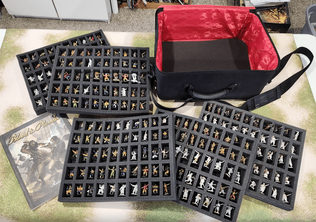 I like the Medium 135 model version for faction specific forces (or some of my other smaller games) and I have a Maxi 250 model miniature bag case for my leaders, fighting men, cannon crews, sailors, pirates, and my primary use minis. I personally like the bags over the boxes because they come with a shoulder strap. It’s super convenient to throw it on your shoulder and still have your hands free to carry your ships, terrain, or other boxes.