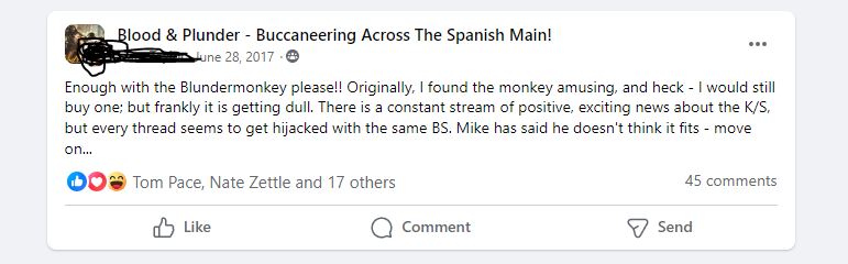 But even after the model was added, there was no rest. No goal was met with such enthusiasm, nay, with such fervor, that it inexplicably caused otherwise rational gamers to open their wallets and bury Firelock’s Miami headquarters with cash. The spell of the Blunder Monkey continued to increase, eventually eclipsing the glory of the mighty Galleon itself! It increased to such power that the esteemed community member (we will call him LT), a historical consultant, ship expert, and associate designer, was forced to post this cheerful command to the enthusiastic hordes of Blunder Monkey fans: