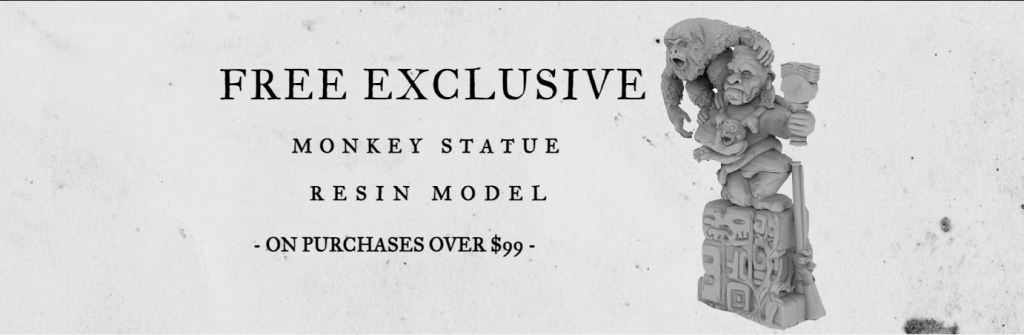 Now, in 2024, the Blunder Monkey has suddenly, without warning, risen again like a phoenix from legend! The original Monkey Statue model is again within your grasp! Do not spurn this opportunity to become part of this tale, and join the great legend of the Blunder Monkey! With an order of $100+ of any product from Firelock Games, you will receive a free Blunder Monkey Statue miniature. This time the model has been reincarnated in a more glorious form – highly detailed resin.