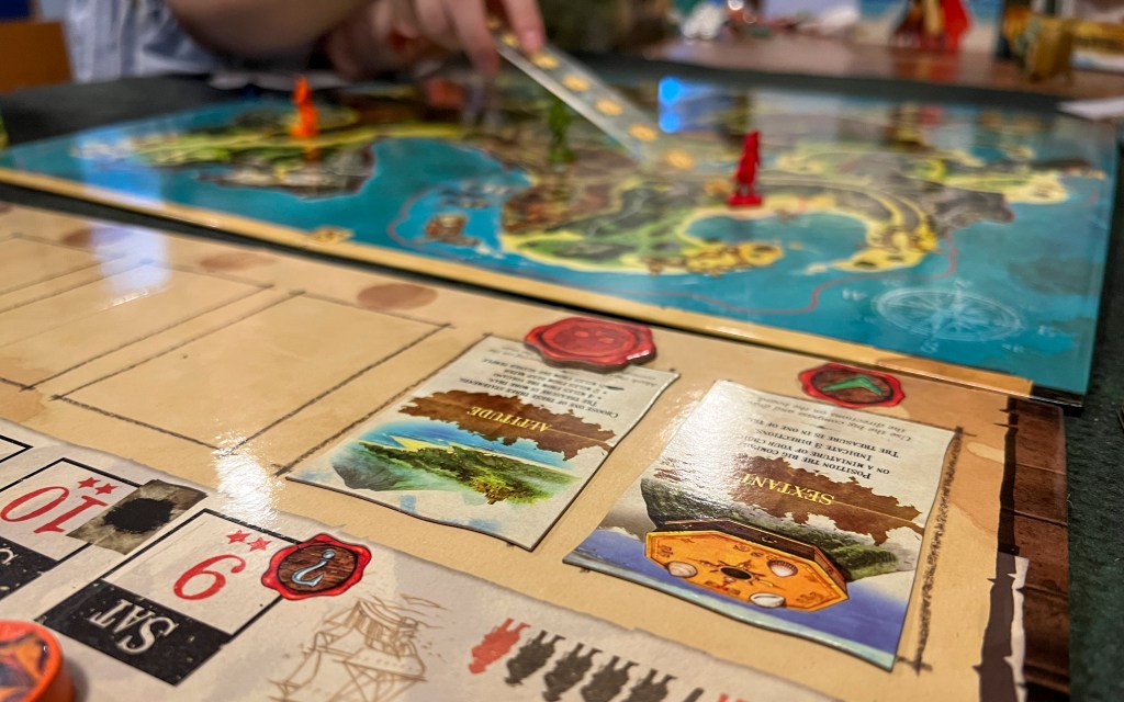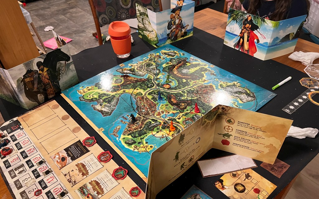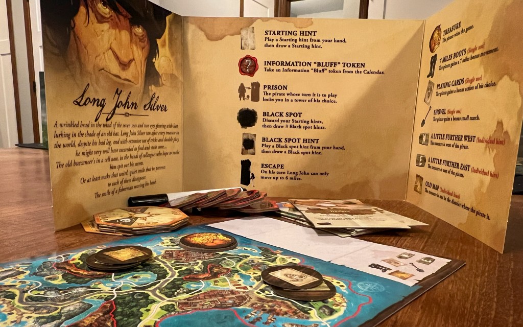 The Long John Silver player have a “hand” of clues that he can reveal to the players as a group, with the “weaker clues” only available if he gives another smaller clue or perk to an individual player. The challenge is to provide the most unhelpful clue possible, while giving private information to different players that may throw them off track. Trying to remember what each player knows and feed them unhelpful information is tricky and very fun!