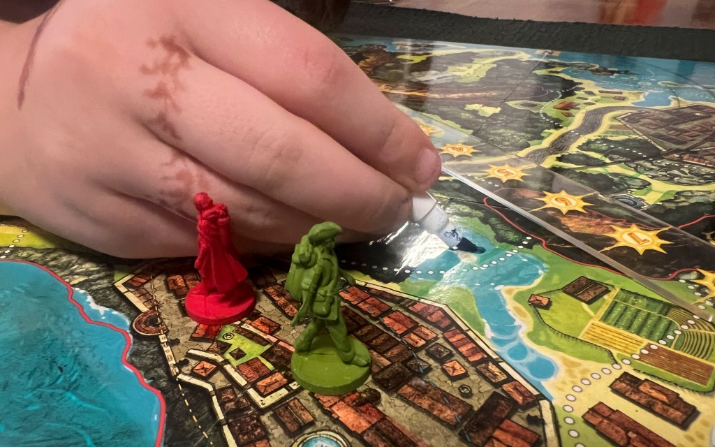 This is a beautiful game and it’s very “non standard” for a board game. Since you a using dry erase markers on both the main board and the mini map, everything has a shiny sheen to it which is a little annoying just because of the bright reflection of lights, but that’s unavoidable. It comes with dry erase markers of various colors and some were more visible than others when used on the map.