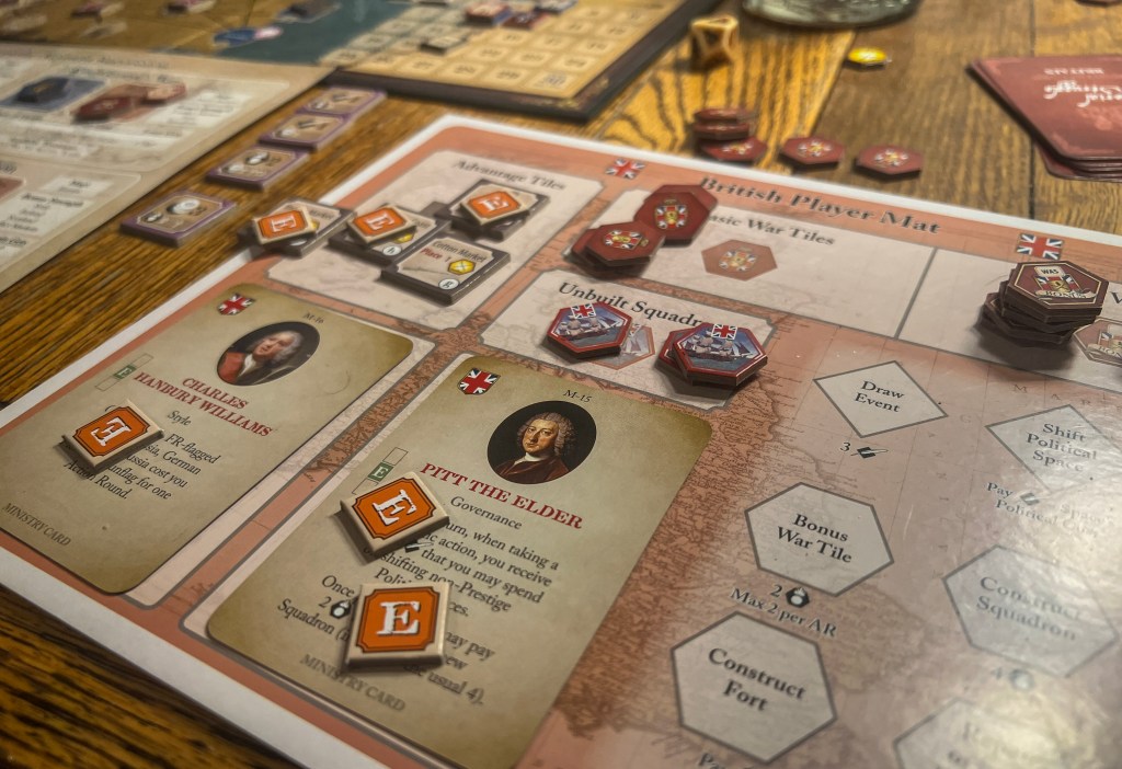 First, the Ministry Cards give each nation several ways to approach a game. The French player can really focus on European diplomacy and try to undermine British rule through the ongoing Jacobite plots. Or, they can ignore that and focus on good relations with the rest of the European powers, raking in bonus “Treaty” action points from favor with other monarchs. Or they can focus on building their naval power and supporting their outlying colonies. The British have meaningful choices between strong banking, aggressive mercantilism, or stronger relations with Ireland and Scotland to scuttle the Jacobite plots. Some Ministry Cards seem stronger than others, but after several plays, some were expected and then subverting those expectations and going a different direction was really fun!