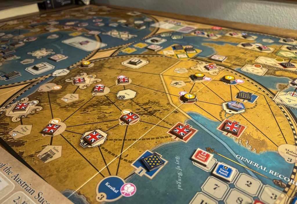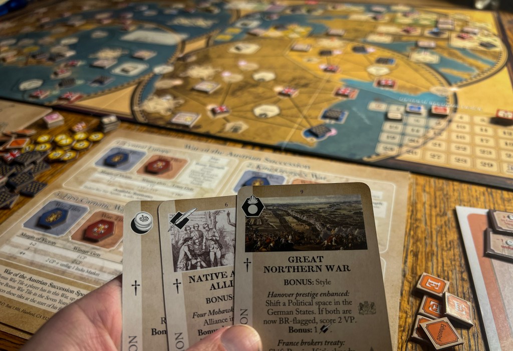 This game plays out over 3 different “eras,” punctuated by 4 major war turn resolutions. The Succession Era focuses on the War of Spanish Succession, the Empire Era is interrupted by the War of Austrian Succession and culminates in the War of Austrian Succession, the Revolution Era is punctuated by the 7 Years War and culminates in the American Revolution.