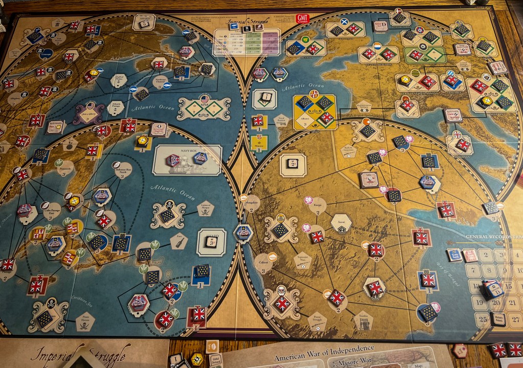This is a beautiful game! It’s a GMT game, so there’s no minis or extravagance, but the board is functional and looks great, the cards are well laid out with great period art, the chits and bits are all fine. I keep using Twilight Struggle as a comparison because I assume more people have played it, but this is certainly a step up from that game in production values. Twilight Struggle is fine, but this is just a little nicer all around. Or maybe I just like 18th century aesthetics more than 20th century.