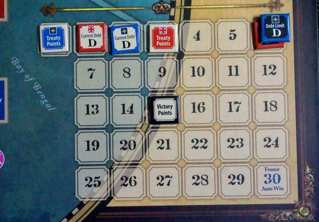 Just like Twilight Struggle, there is a linear scoring track that one marker moves across so the game is either tipped in the favor of one player or the other, or exactly balanced in the middle. When any player gains points, the one marker is moved to the left or right. The game starts with the VP marker balanced at 15. If it is above 15, the French are winning and if a game turns ends at 30 or higher, the French automatically win. If the VP track marker is below 15, the British are winning and if it reaches 0, they automatically win.