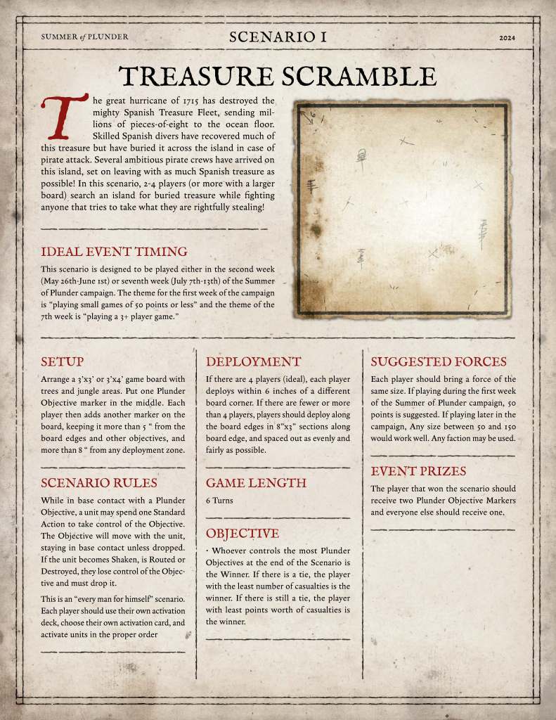 Specifically, there’s an intro page, a page with instructions for events during the campaign, a page for Oak & Iron events, and then 3 full Blood & Plunder scenarios designed for play during the Summer of Plunder campaign.