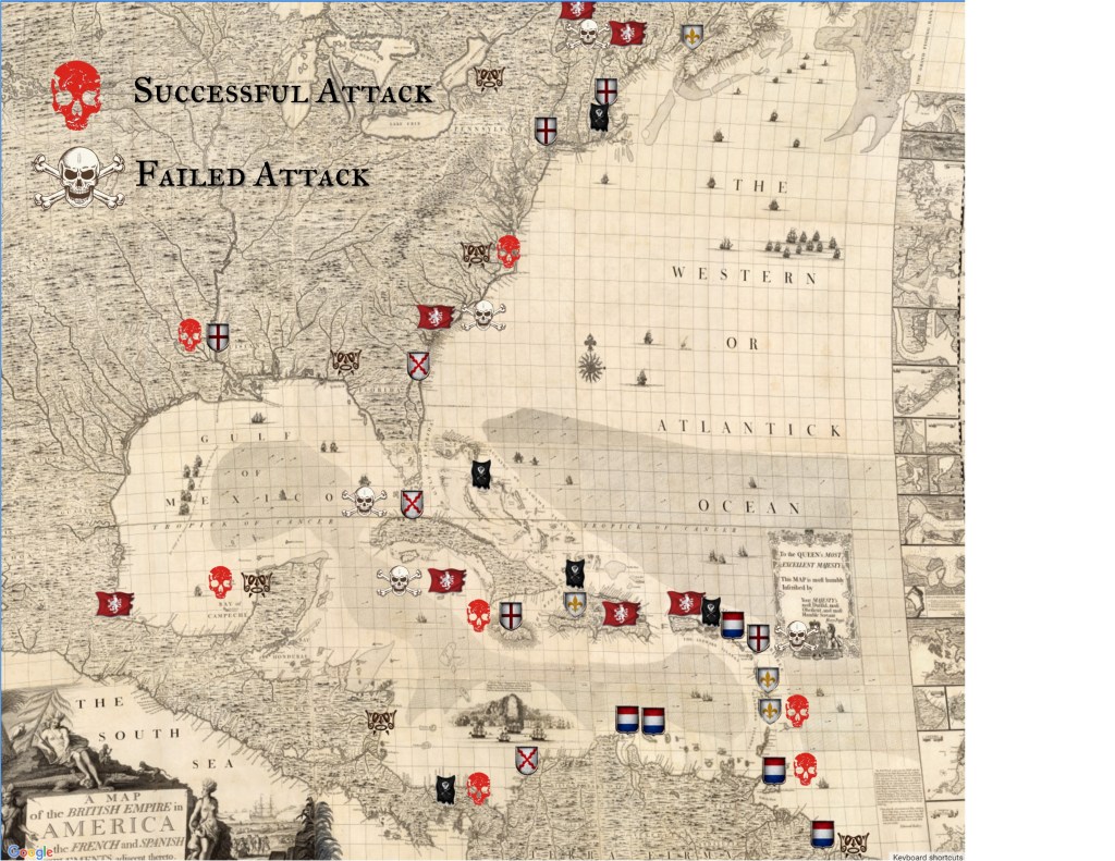 There were a couple of large conflicts particularly the battle in Jamaica between the British and Spanish. The Pirates struck at Panama and captured a location from Spain. But all other nations seem caution and unwilling to attack each other early in the campaign. Most battles occurred and nations sought to claim the Unaligned territories in the region. Nearly all were successful as only 5 of the 12 Unaligned location remain to be conquered.