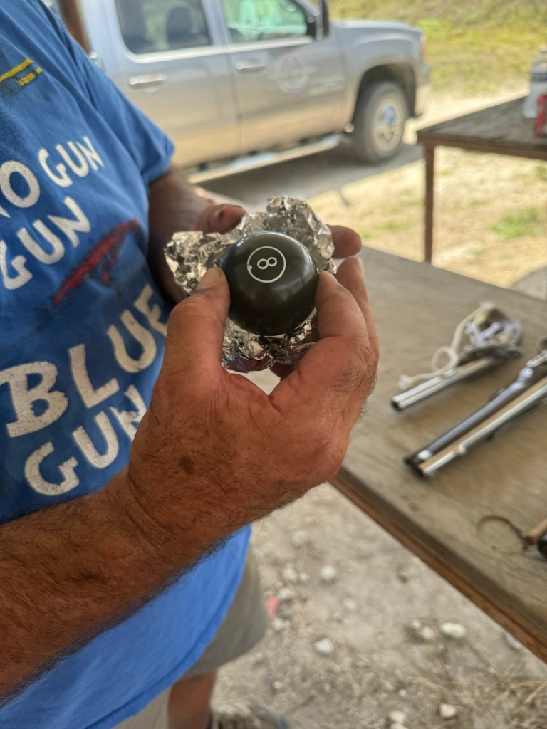 Michael uses billiard balls and tennis balls as ammo for the hand mortar, but we only had billiard balls on our trip to the range. There is a distinctive “bloop” sound that comes from the projectile leaving the barrel, and the recoil was not terrible at all. I was ready to get rocked, but it was more of a gentle push.
