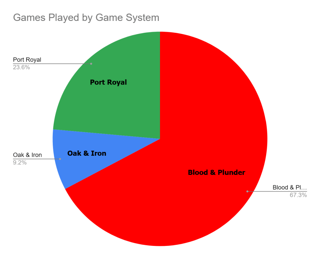 We have had a total of 797 games played in the first 3 weeks of the campaign! This week saw an uptick in the number of Oak & Iron games, pushing it closer to 10% of the overall. Port Royal continues to stay strong with close to 25% of the content, which is impressive for its first year in the campaign and being less than 6 months old.