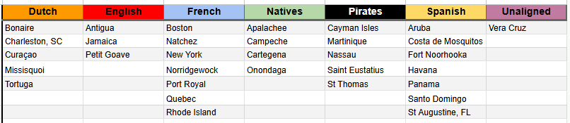 - Vera Cruz: “Colonial ships from the Netherlands, France, and sea rovers elements from Flying Gang (Pirate) all arrived off the coast of Vera Cruz, each hoping to establish a permanent foothold in the unclaimed territory. Crews disembarked, scouted inland, and opened cautious exchanges with local inhabitants. But within days, illness swept through the camps—fevers, rashes, and weakness spreading rapidly among the settlers. What began as a race for expansion turned into a scramble for survival. As the sickness raged, no faction was able to maintain cohesion or press an advantage, and the competing forces withdrew to regroup. Vera Cruz remains unaligned, its shores marked by abandoned camps and the lingering memory of a failed colonial push. ” (3 way tie! Dutch 3 – French 3 – Pirates 3 – Unaligned 2)