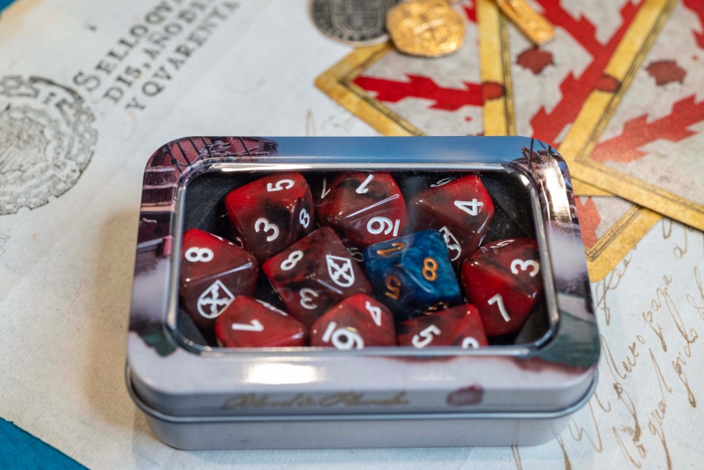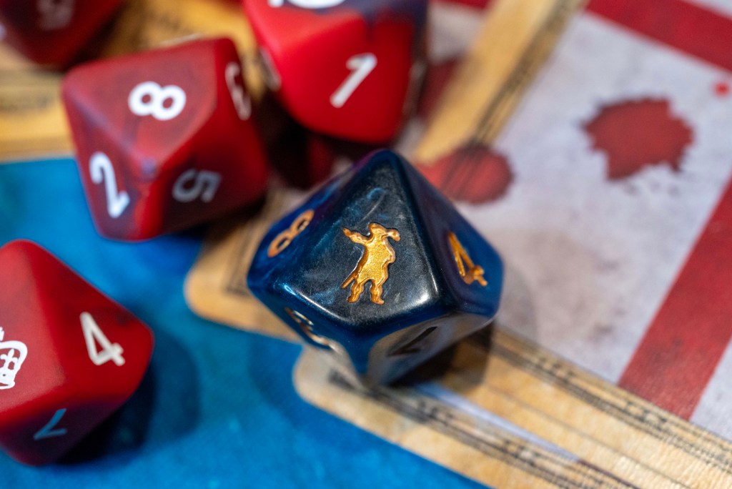 As mentioned earlier, each set includes a single die featuring a blue/black swirl and the English Commander engraving. This unique die is perfect for designating your Commander—who typically wields a pistol rather than a musket. It’s also great for marking a specialized Character like the Sharpshooter, who requires a distinct die when rolling.