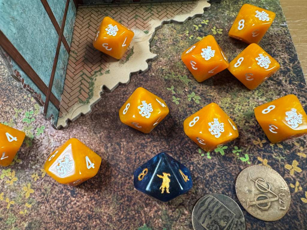 The quality of manufacture, heft, and feel are all important aspects of good dice. However, once all those criteria are met, there is one more factor that reigns supreme in my opinion: aesthetics. The dice have to look good, and Baron of Dice nails the aesthetic. The Dutch dice are glossy and with an orange swirl that feels right at home with Dutch miniatures.