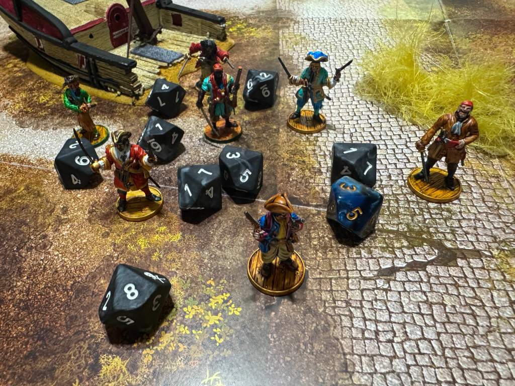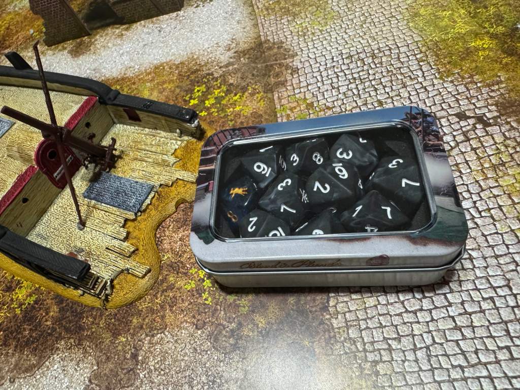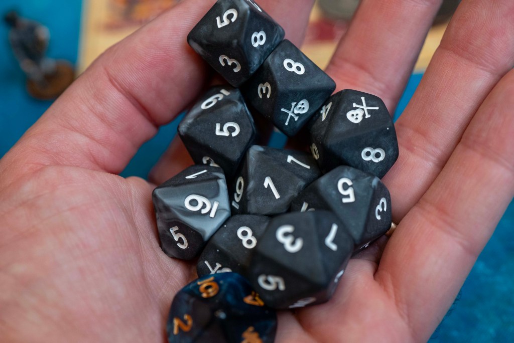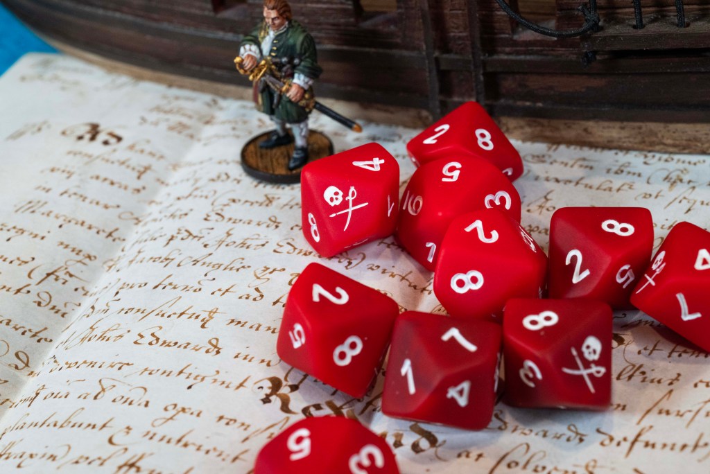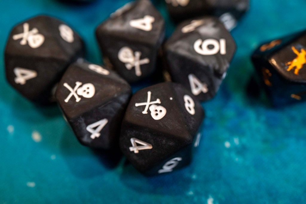 The Pirate dice feel like an upgraded version of those in the Port Royal and Blood and Plunder Starter Sets. They are a matte black with white engraving, and are fun to just have in your hands as a fidget toy.