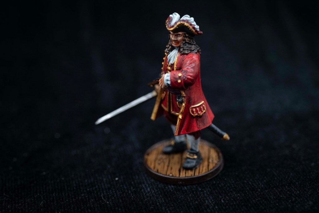 This isn’t a “production mini,” so it might get tweaked a bit before they are sold, but I felt this model was a touch on the larger side. He’s a pretty tall fellow! There’s some variation in human size and in the range of Blood & Plunder minis, but this mini is on the bigger side of the range. Check images at the end of this article for a comparison with other English Commander models.