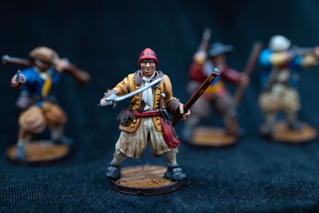 Models are armed with buccaneer guns, one pistol, and a blade of some sort. I appreciate who one model is using his “sidearm pistol” which can be easy to forget. And I really like the model with the cutlass out as well.
