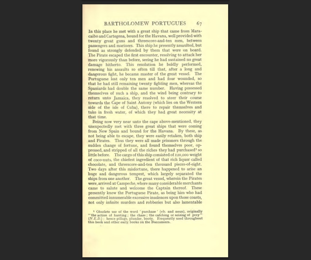 Português was a buccaneer commander sailing out of Jamaica in the 1660’s. He is primarily known to us through Exquemelin’s Buccaneers of America, published in 1678.