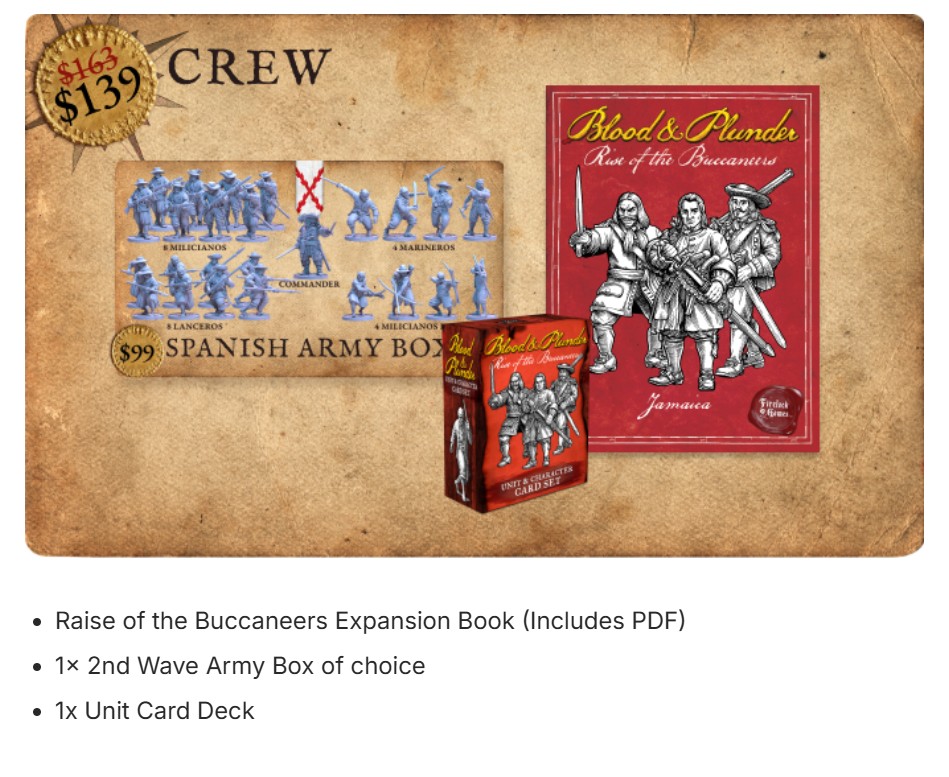 That’s a good $50 is free minis, and about $40 is additional value with the expansion and extra cards. That makes the 25 minis, the Rise of the Buccaneers: Jamaica book, and the stat cards included in the Crew Pledge pretty affordable!