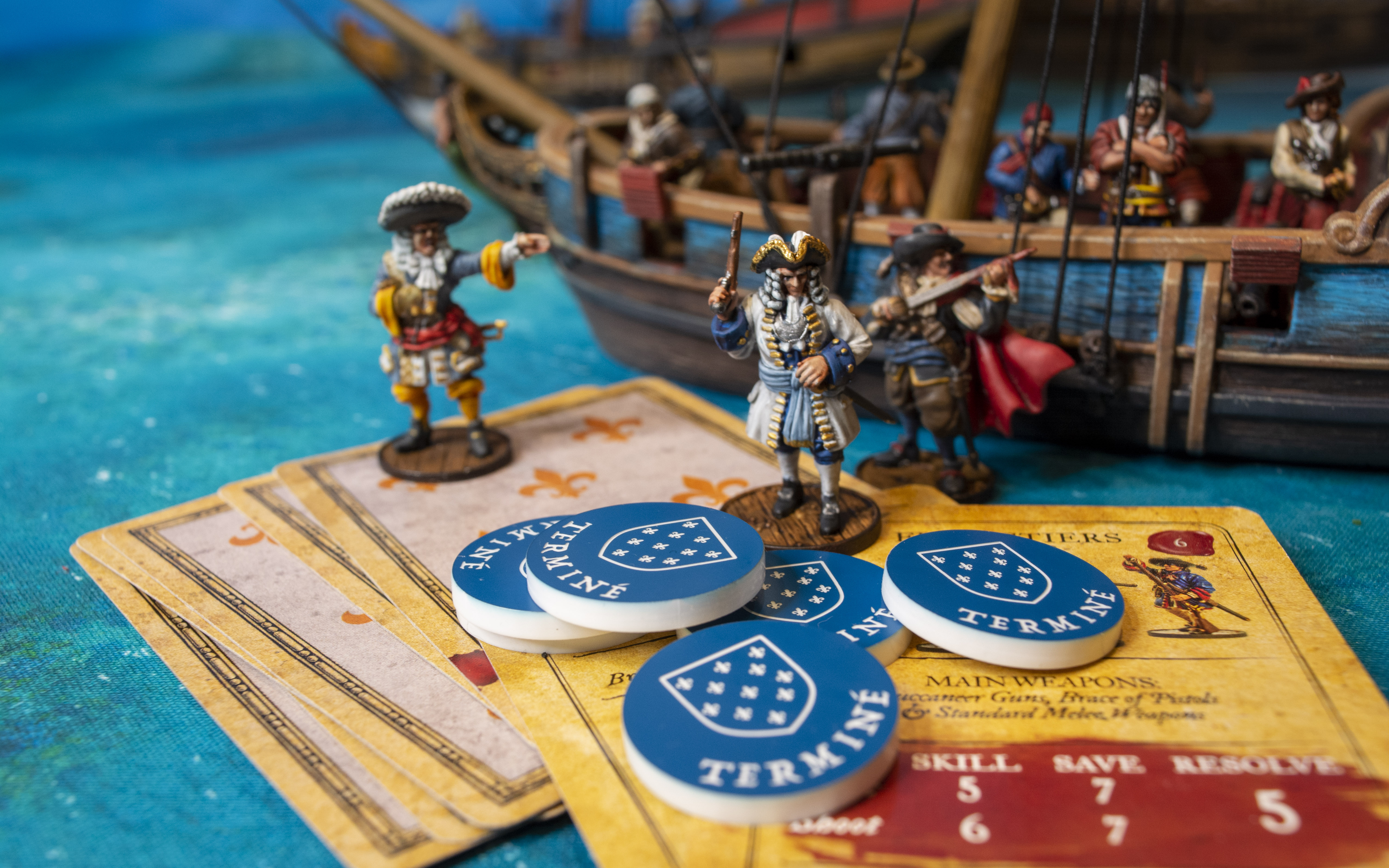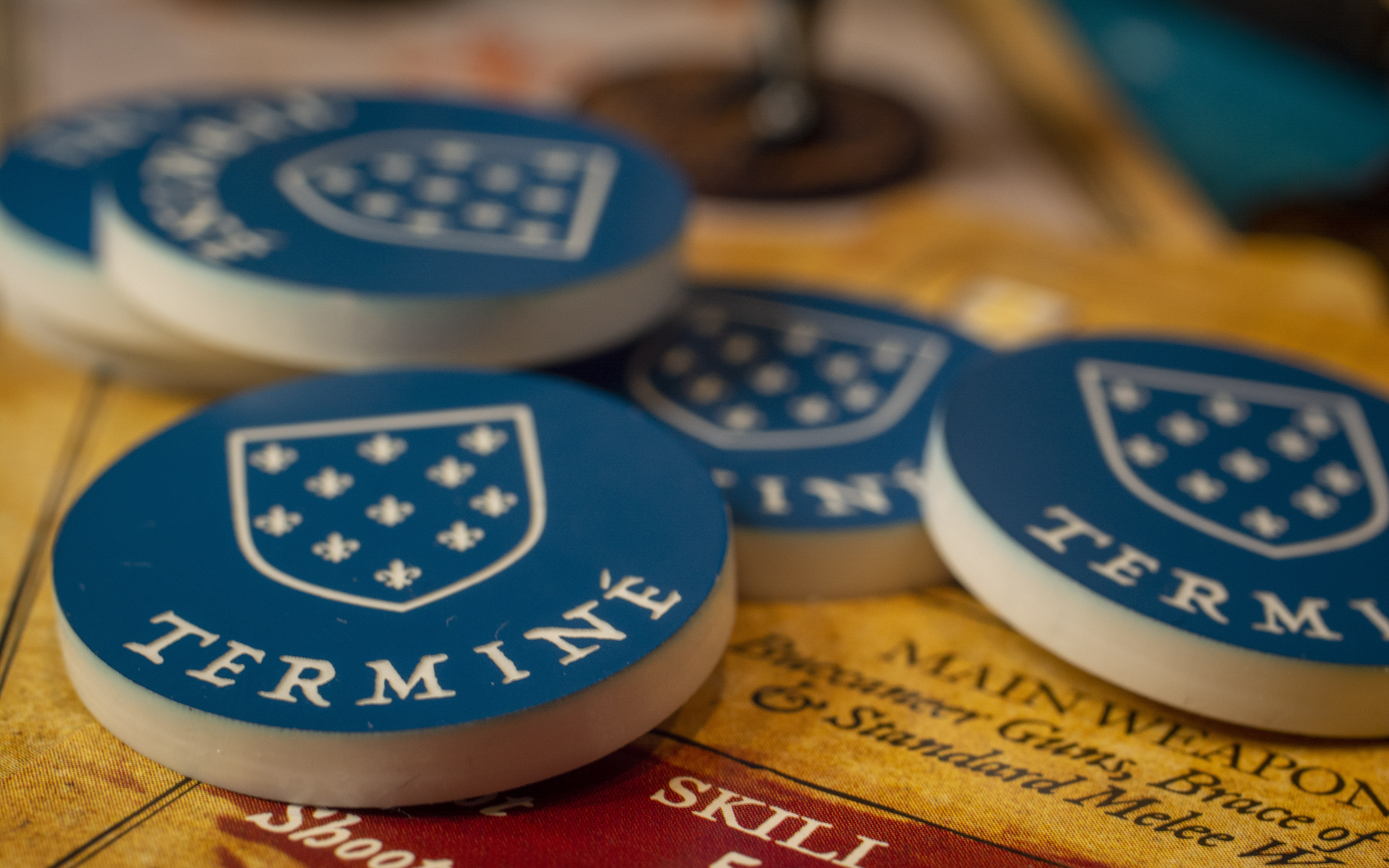 Round plastic tokens to mark units that have been activated. 6 pieces. French tokens using the field of fleur de lis on blue.